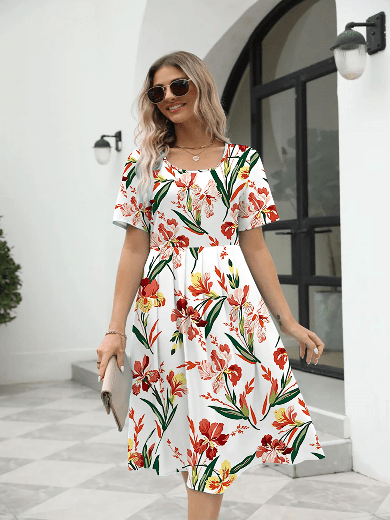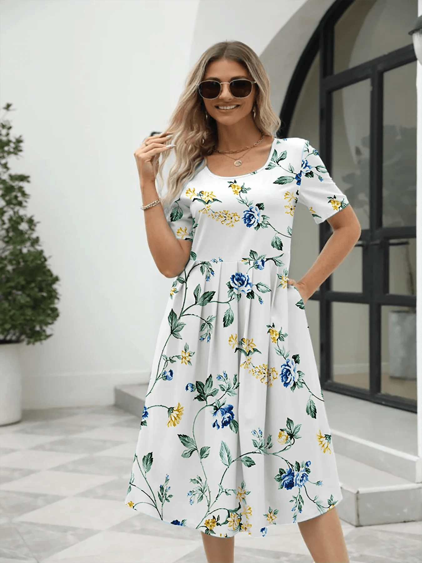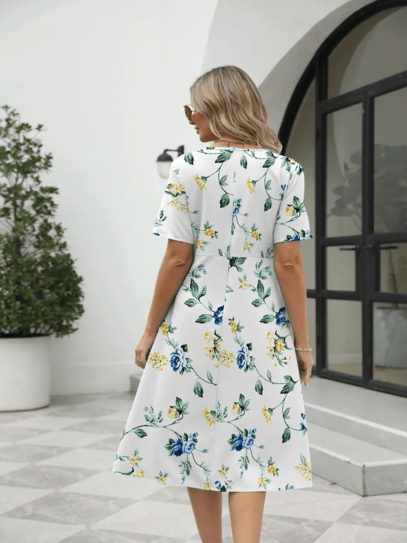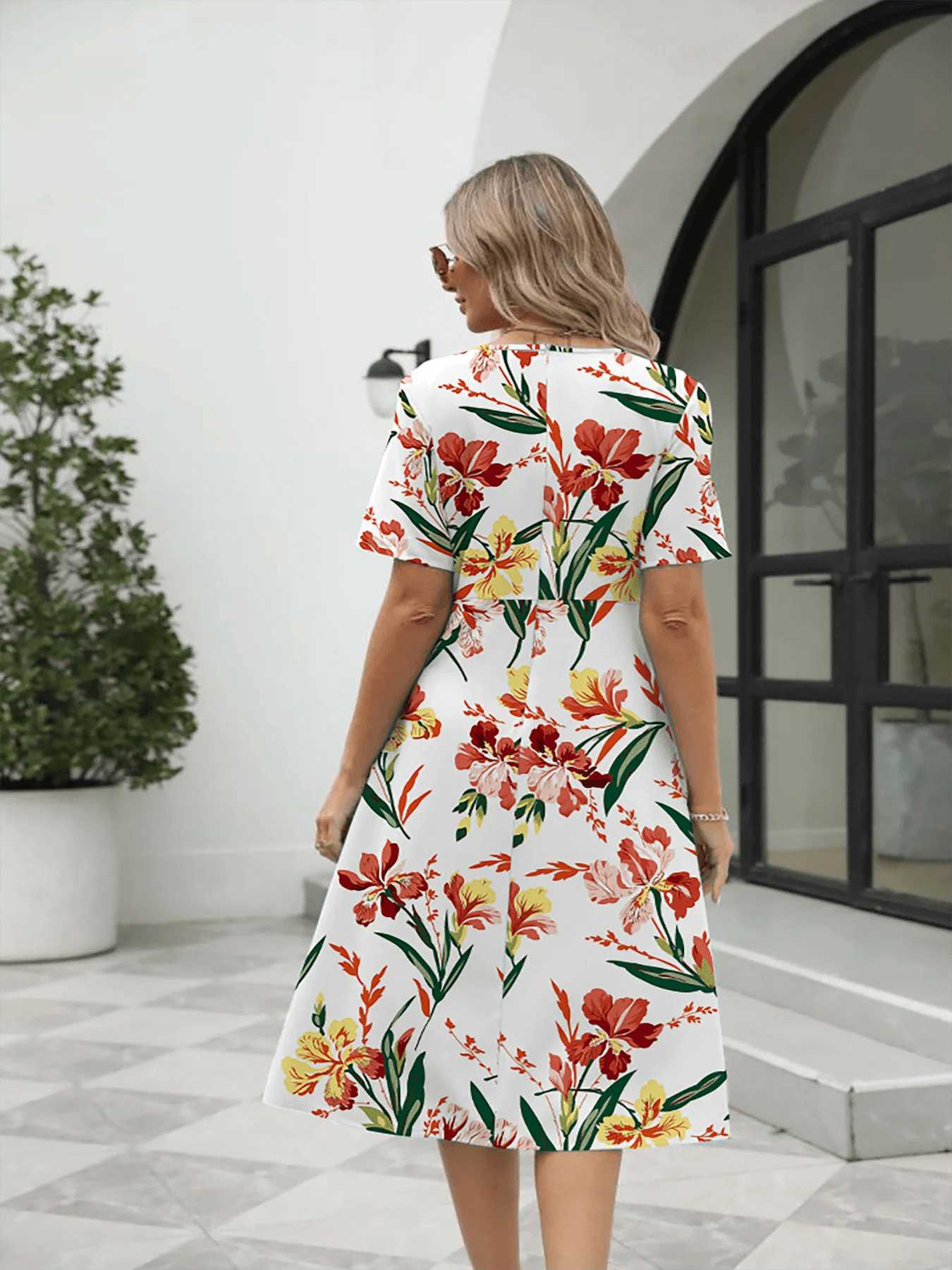 Vestido elegante con cuello redondo, manga corta y cremallera, estampado a la moda para mujer