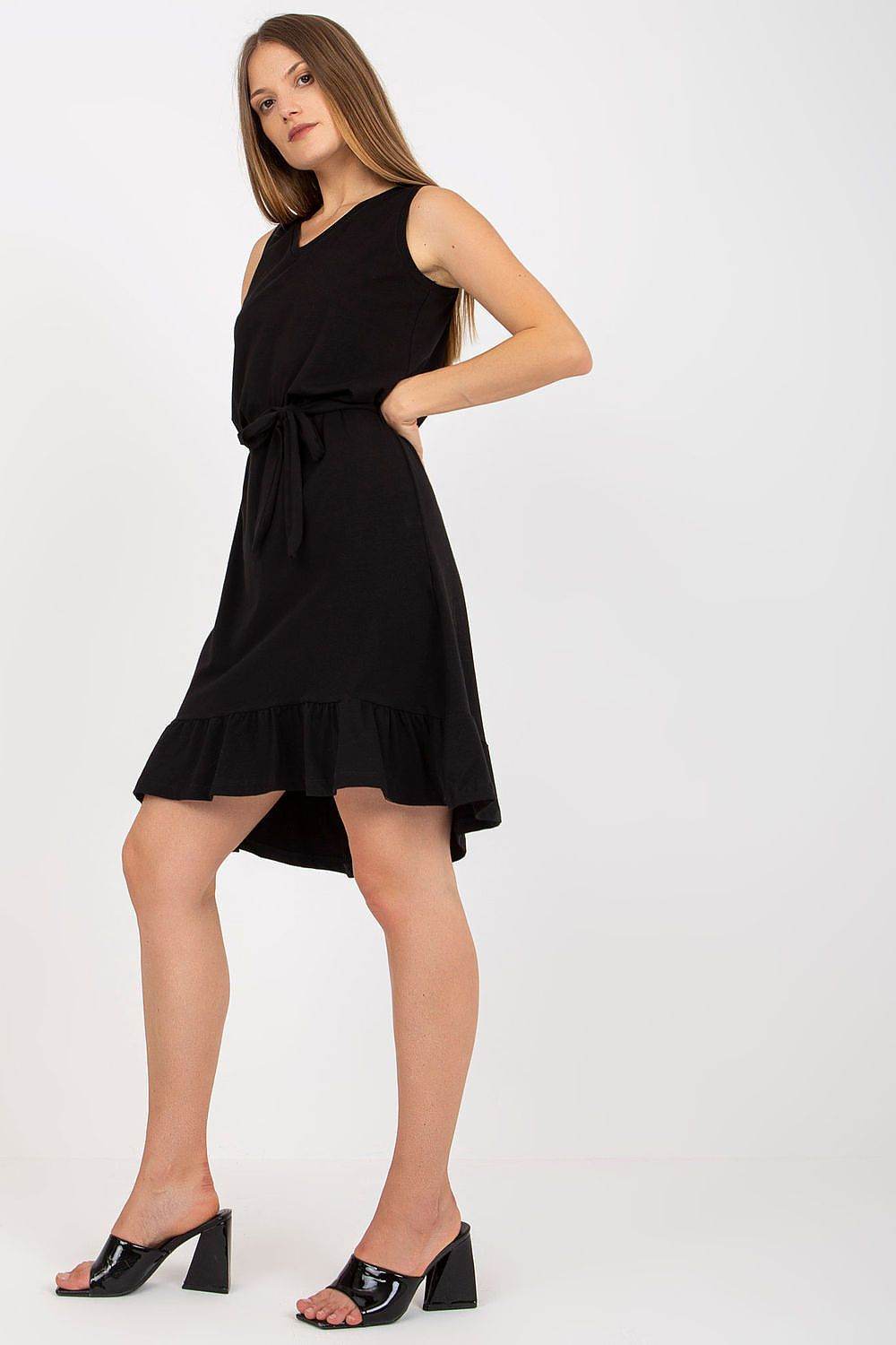 Vestido de verano de corte evasé y sin mangas. Presenta un bajo asimétrico decorado con un volante y escote corazón.... Leer más...
