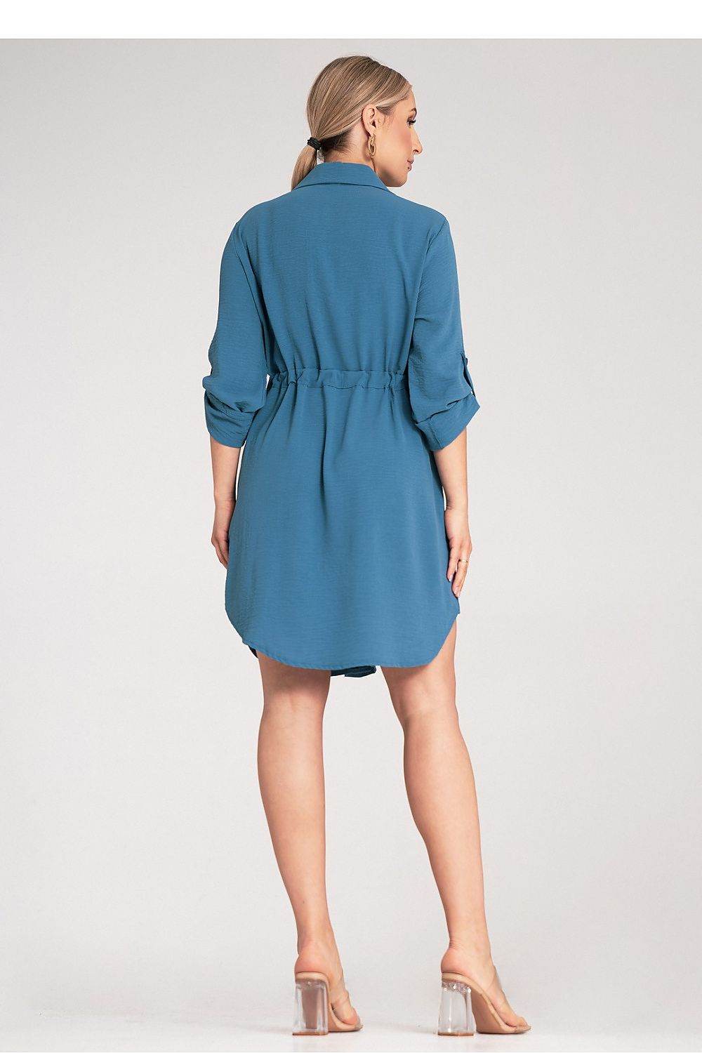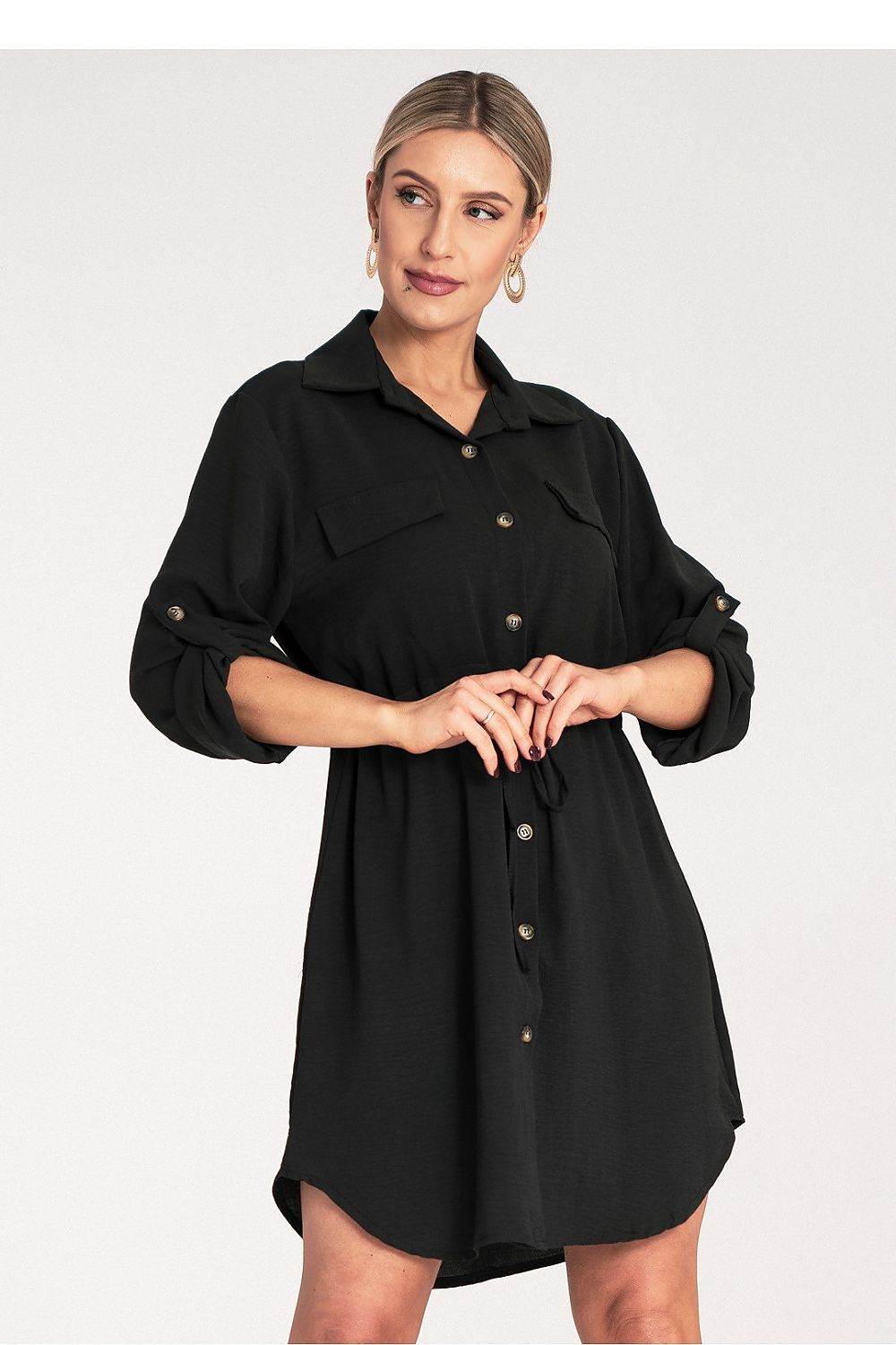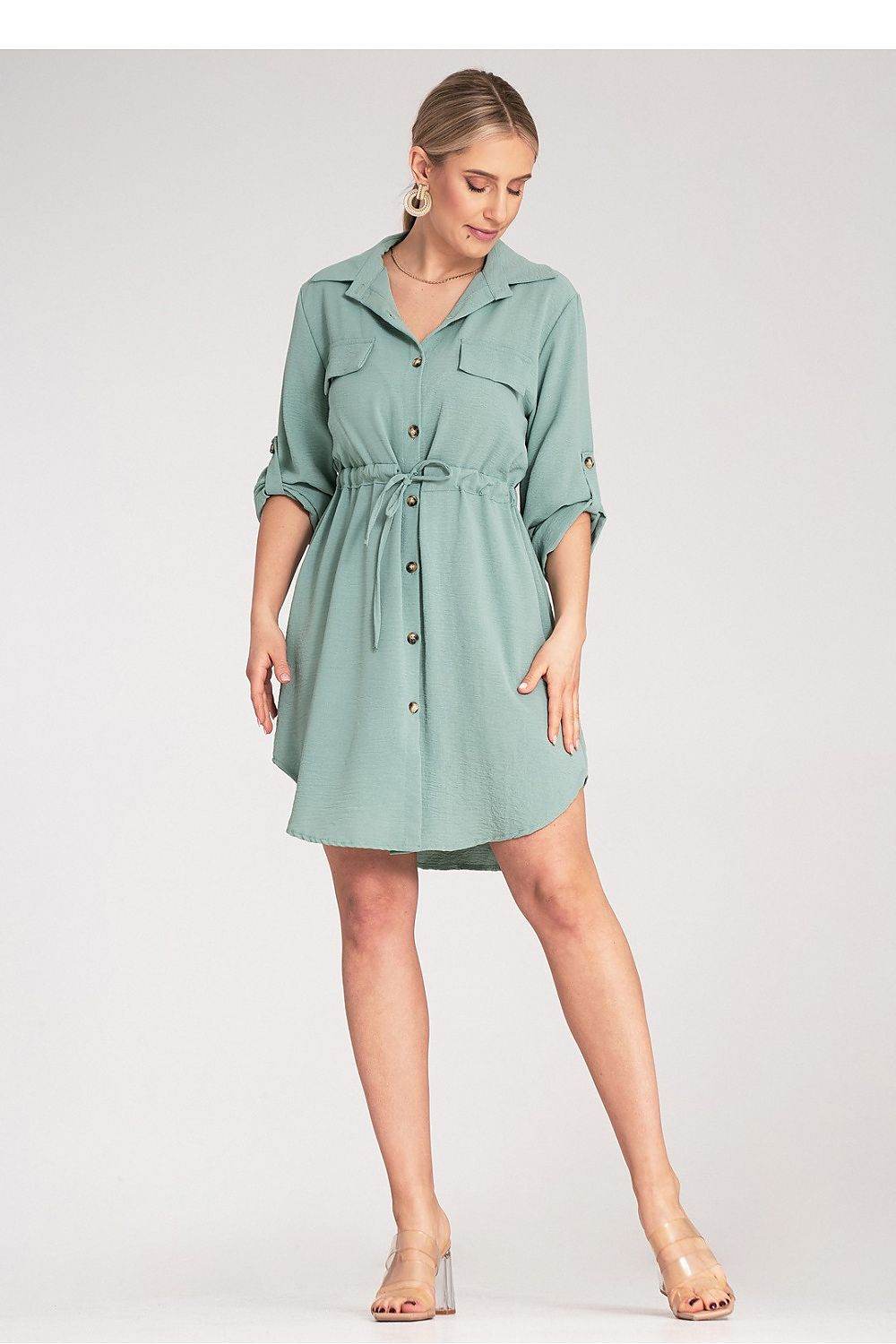 Vestido camisero clásico con lazo en la cintura, botones al frente y mangas enrollables
