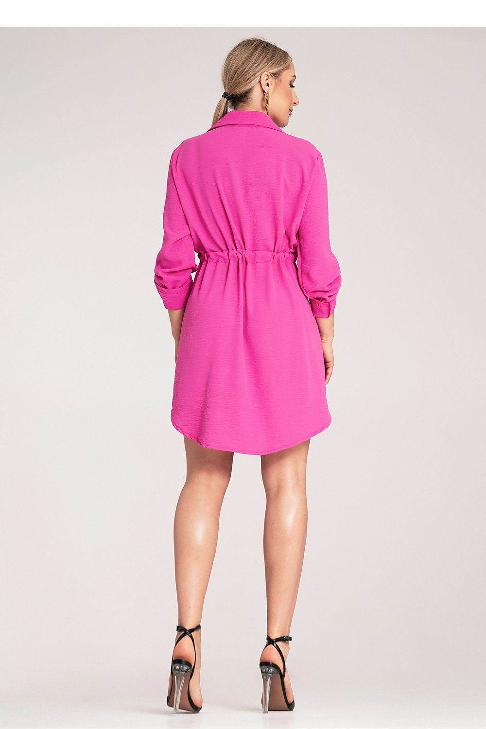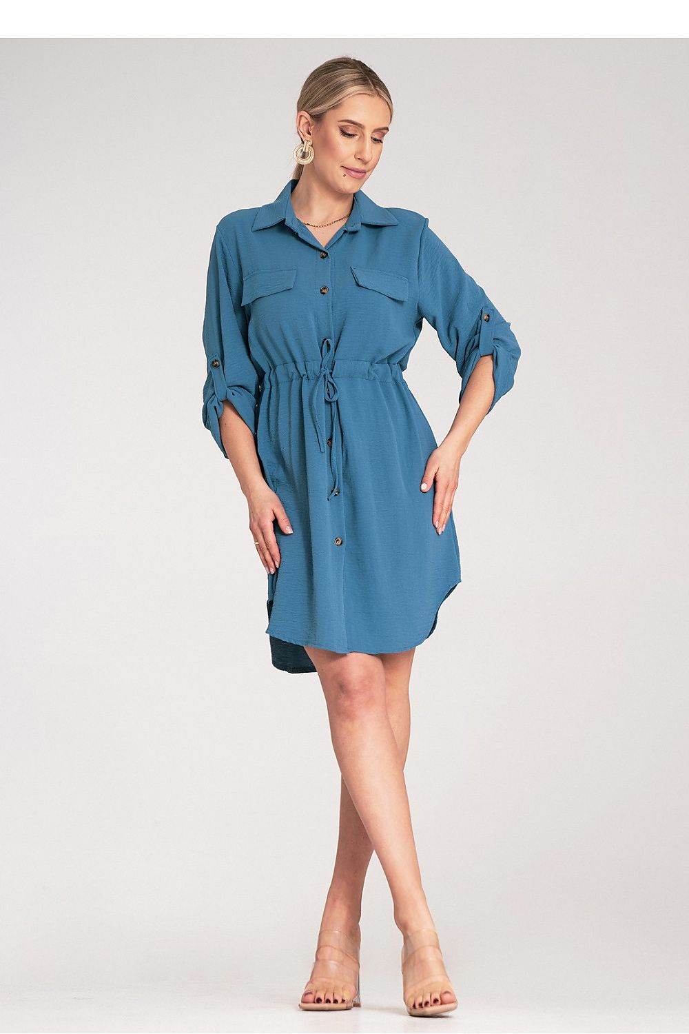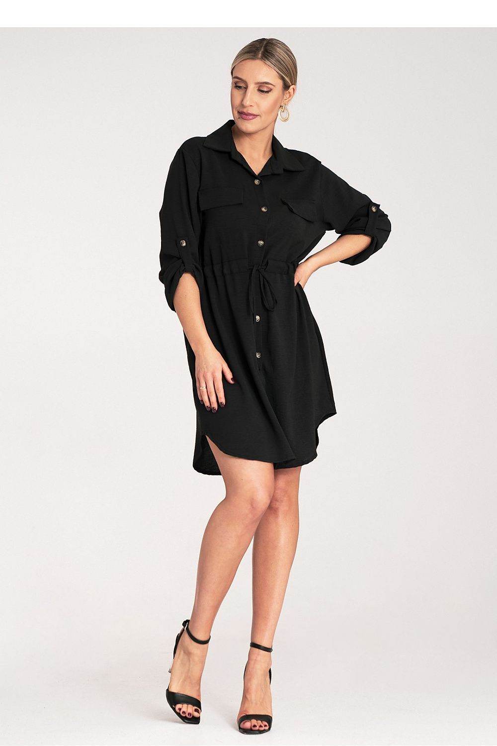 Vestido camisero clásico con lazo en la cintura, botones al frente y mangas enrollables