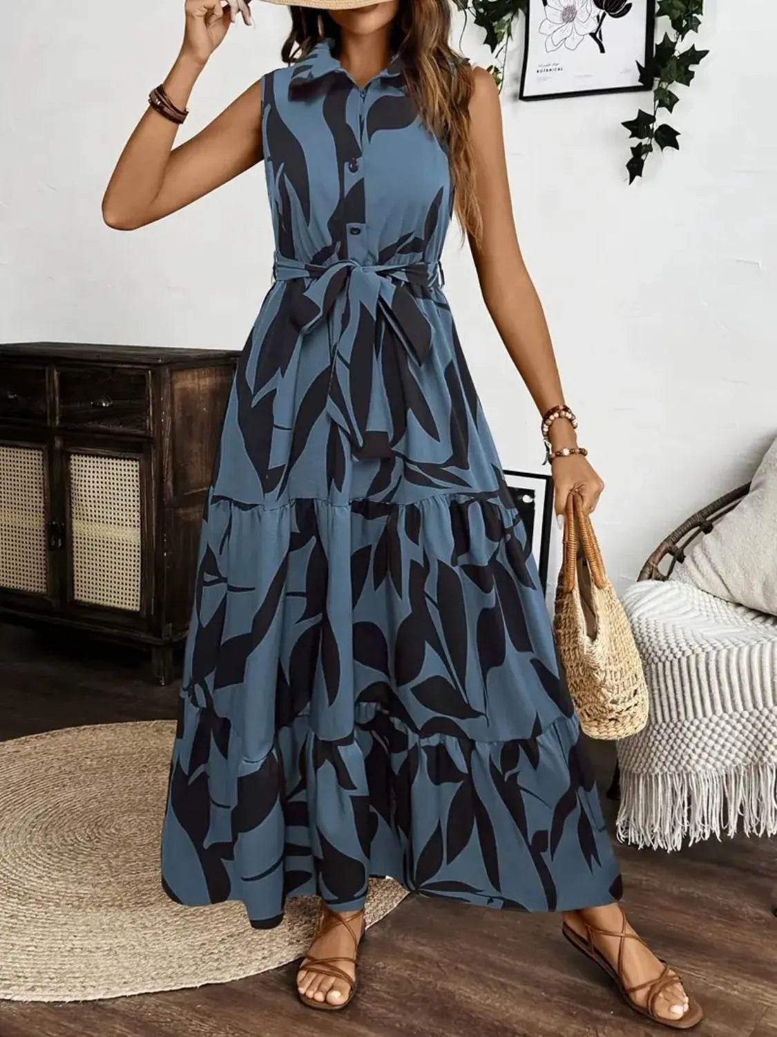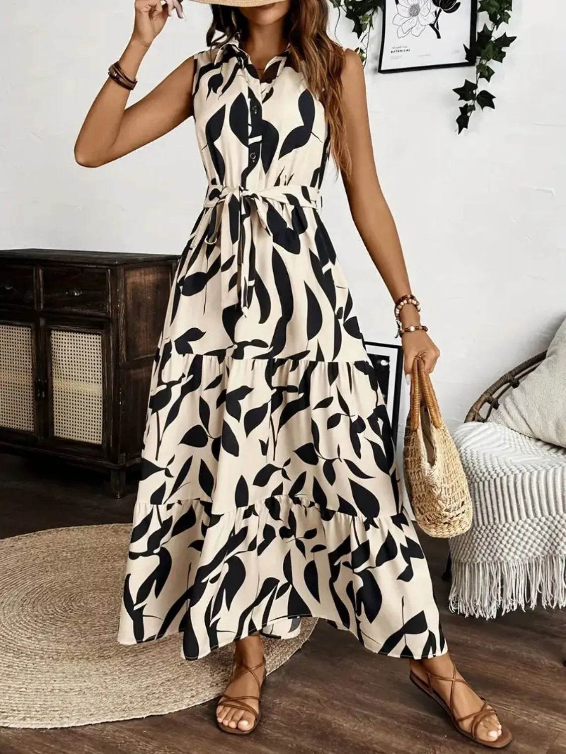 Vestido largo sin mangas con lazo en la cintura y estampado