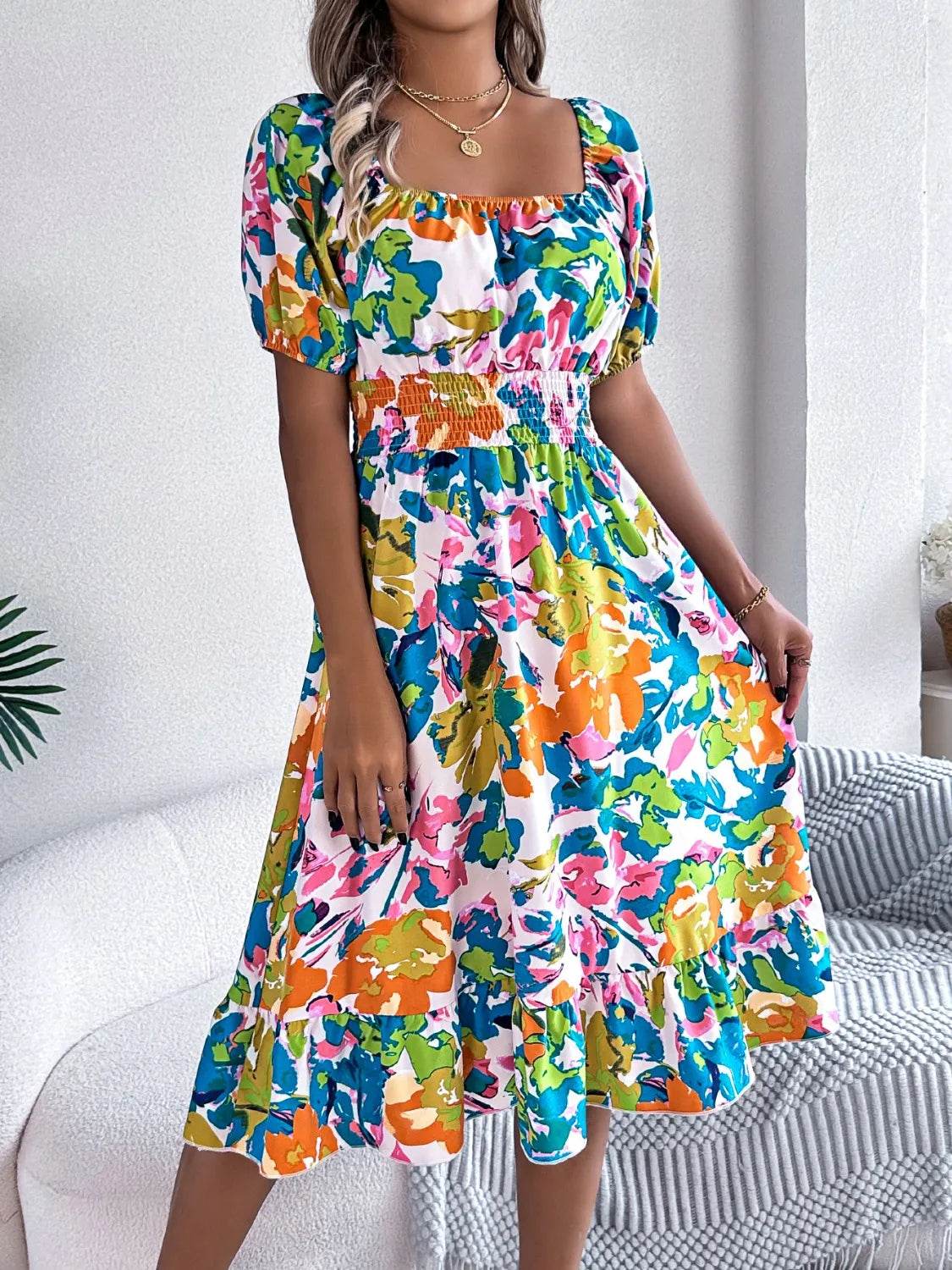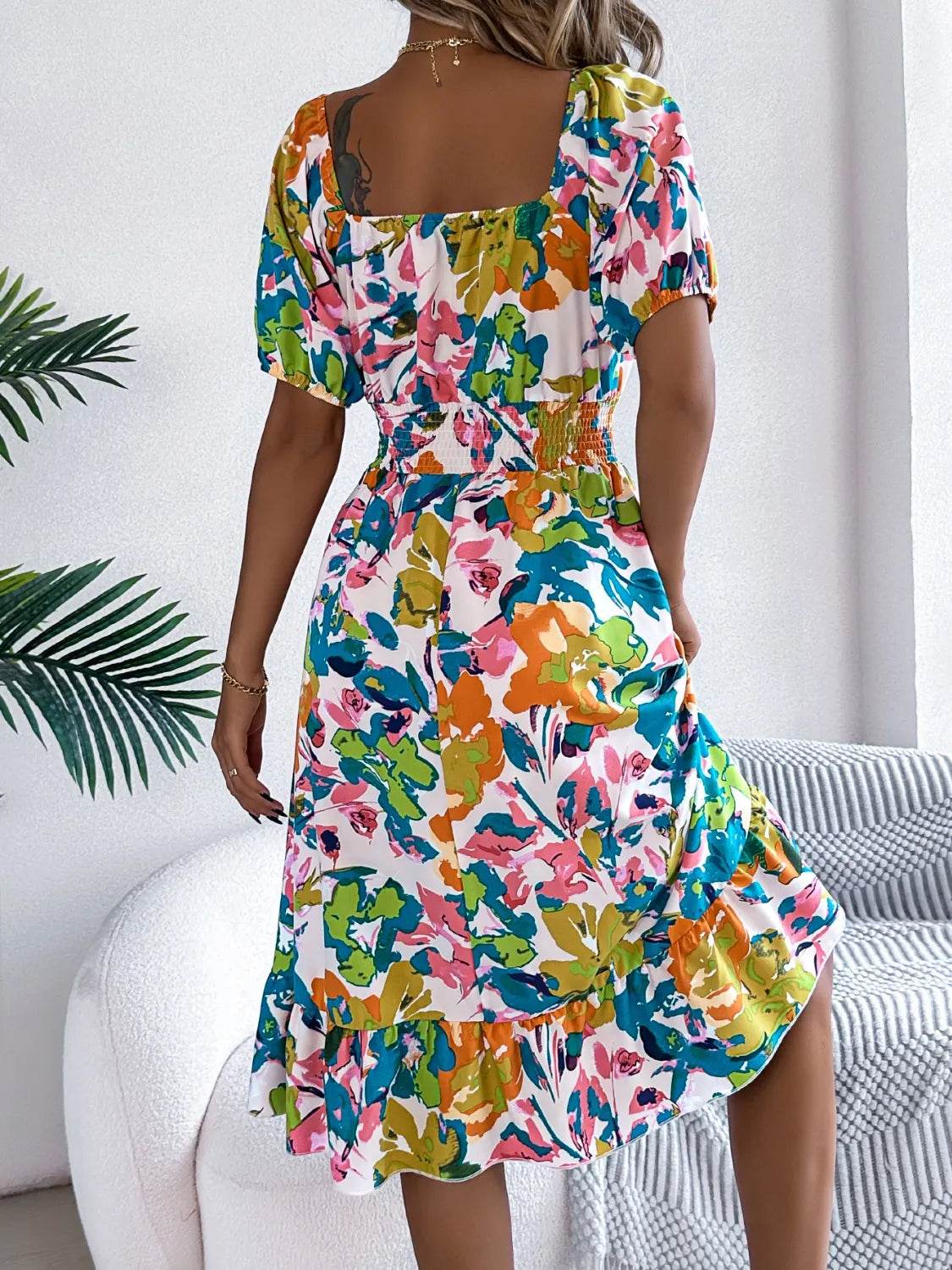 Vestido midi de manga corta con estampado floral fruncido y bajo con volantes