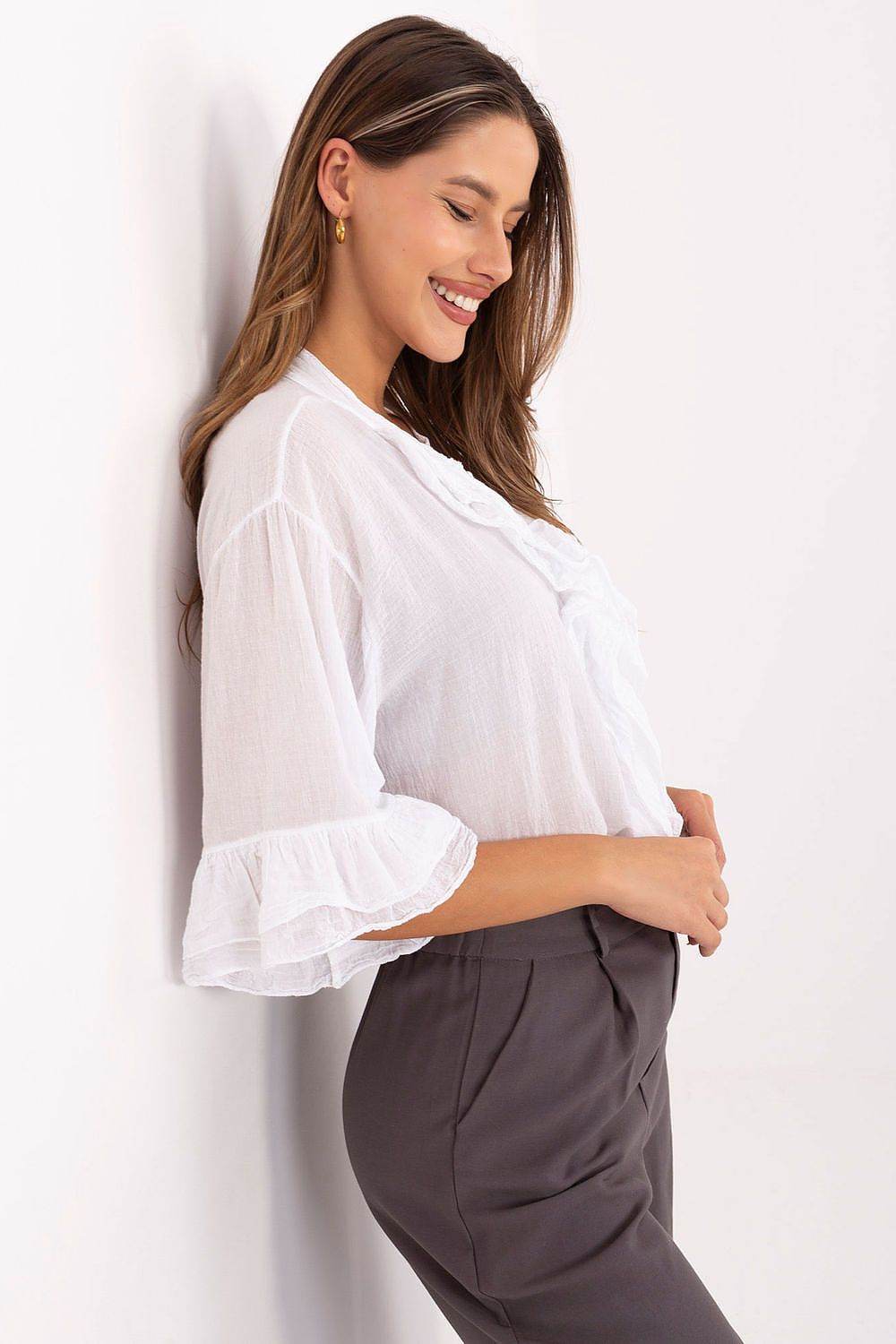 Camisa de algodón bohemia: cuello en V, abotonada, mangas con volantes y detalle frontal