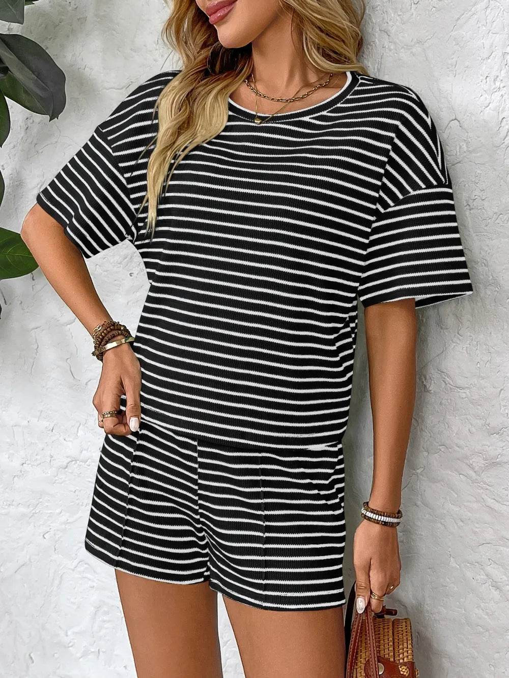Conjunto de top y pantalones cortos de manga corta con cuello redondo a rayas