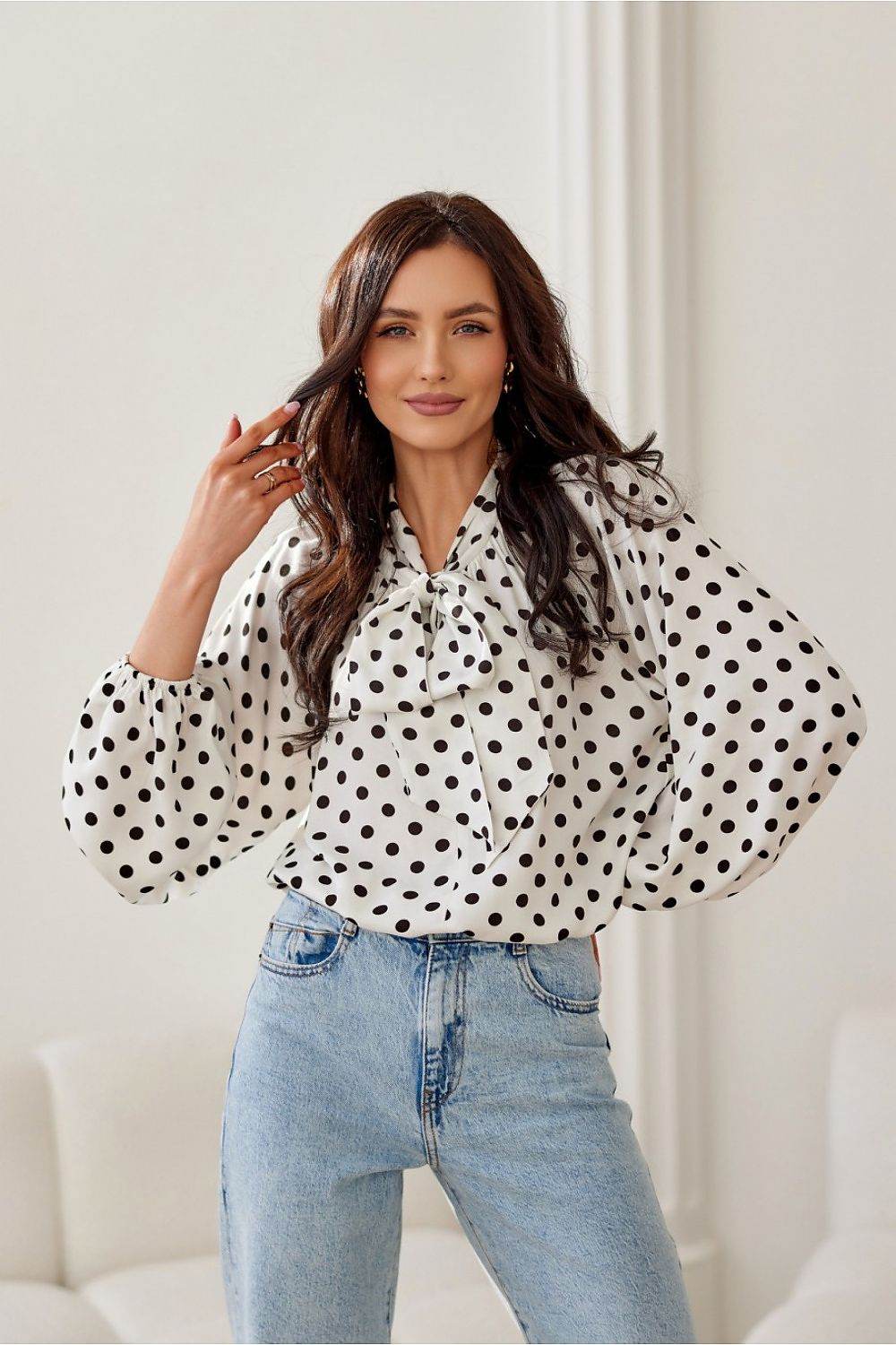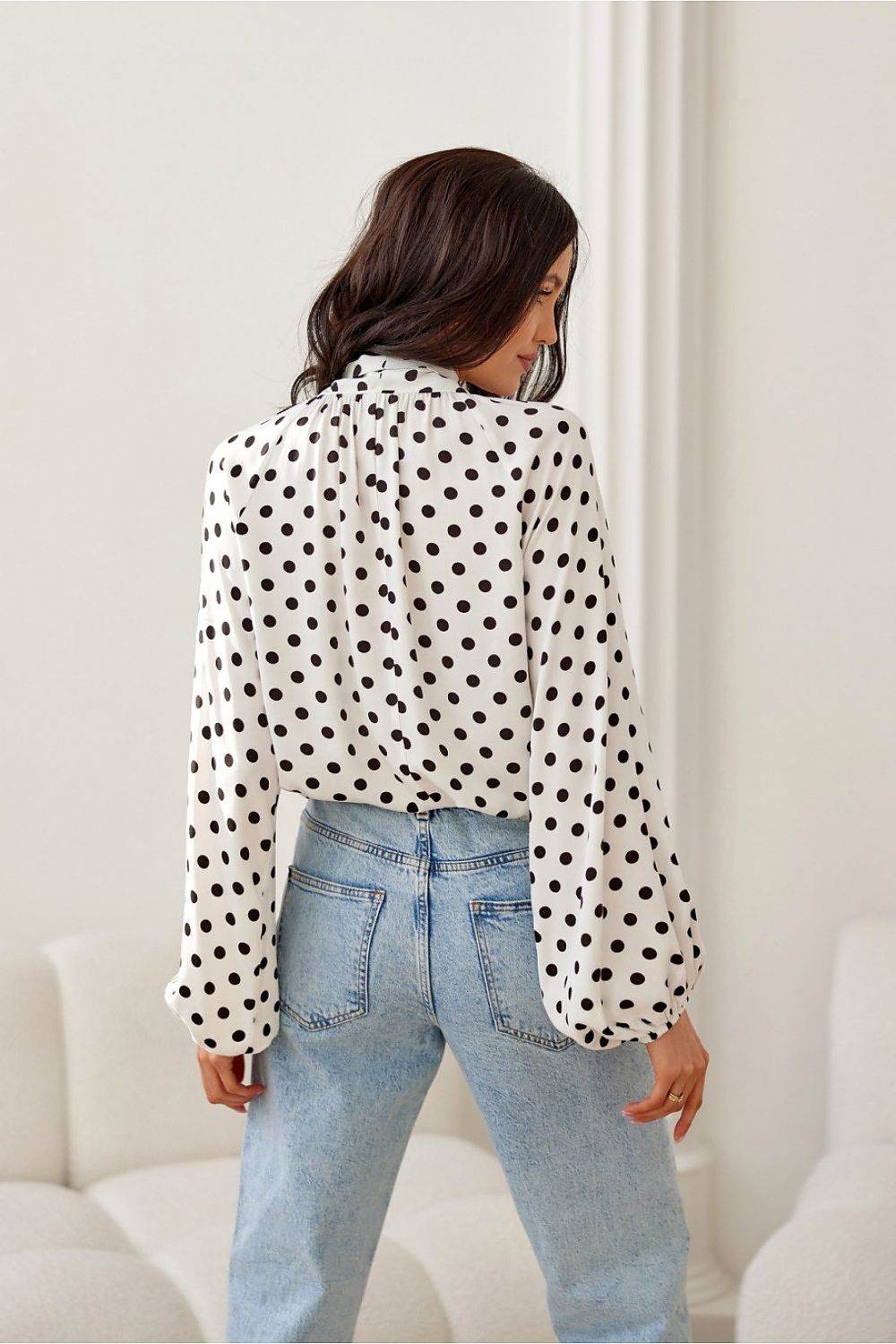 This cropped blouse features a collar and lapel neckline, complemented by long, voluminous sleeves and a waist tie for a... Read more