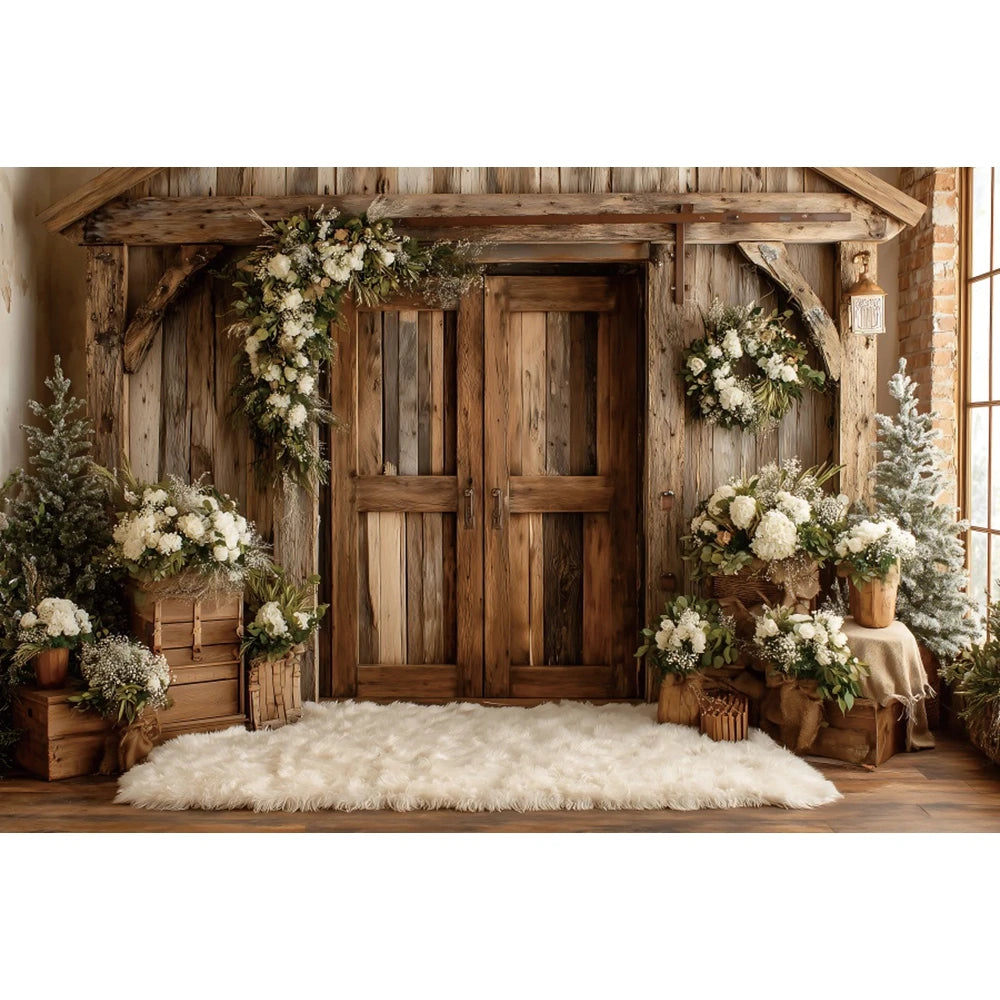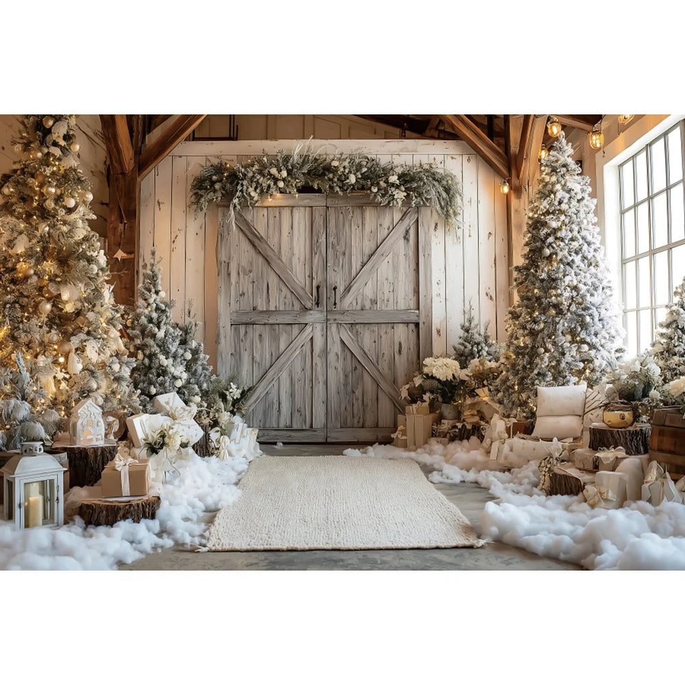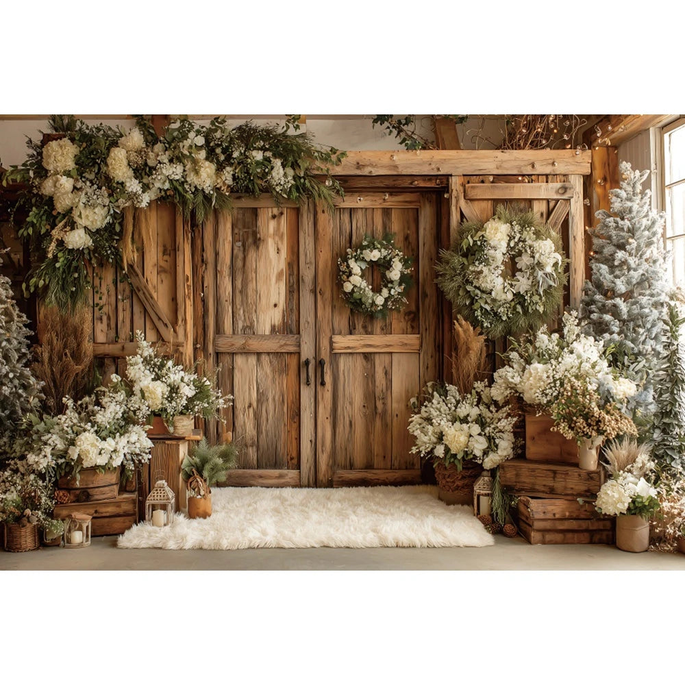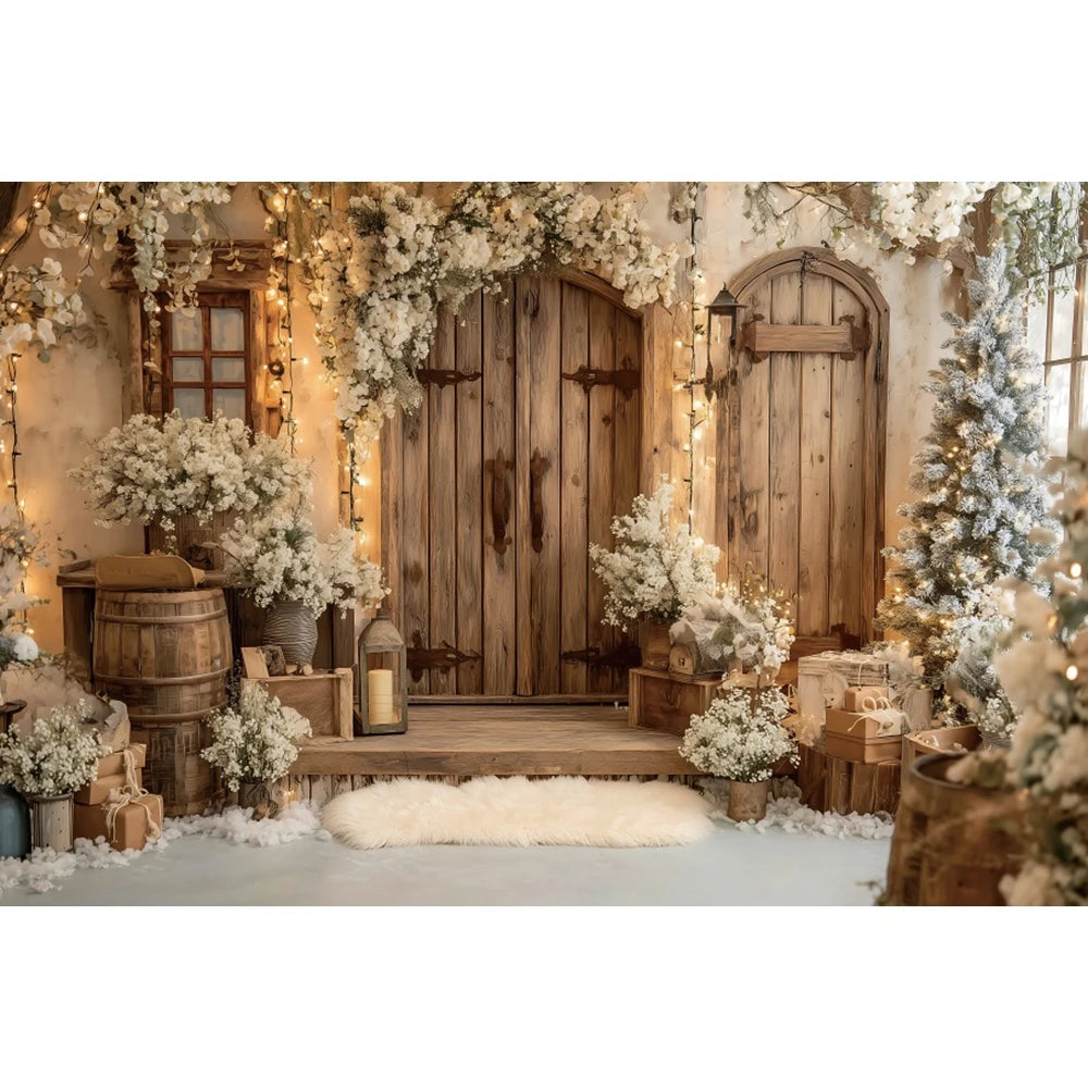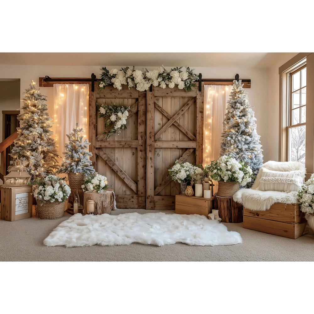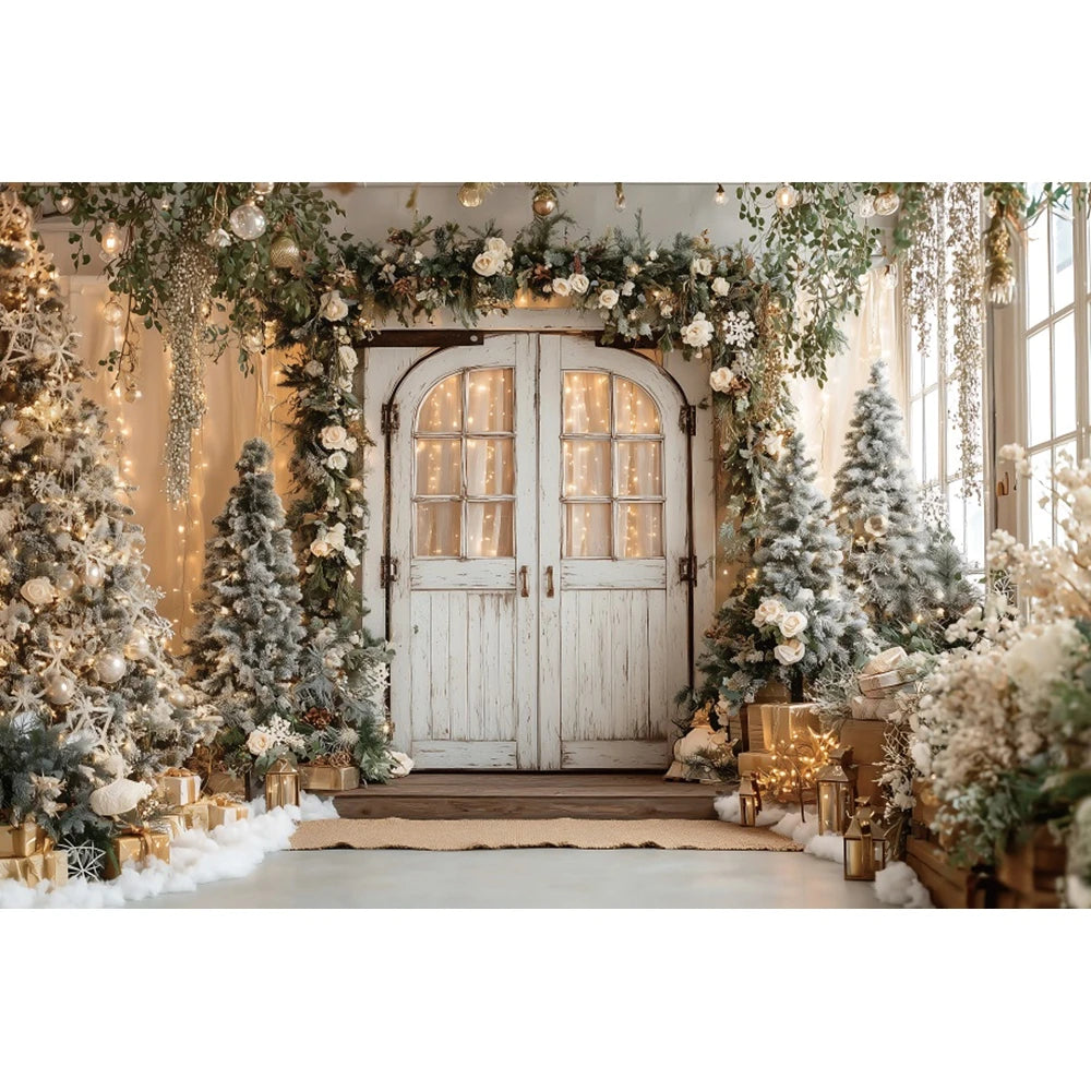 Christmas Backgrounds For Photographs Christmas Tree White Wooden Door Winter Snow Decorations