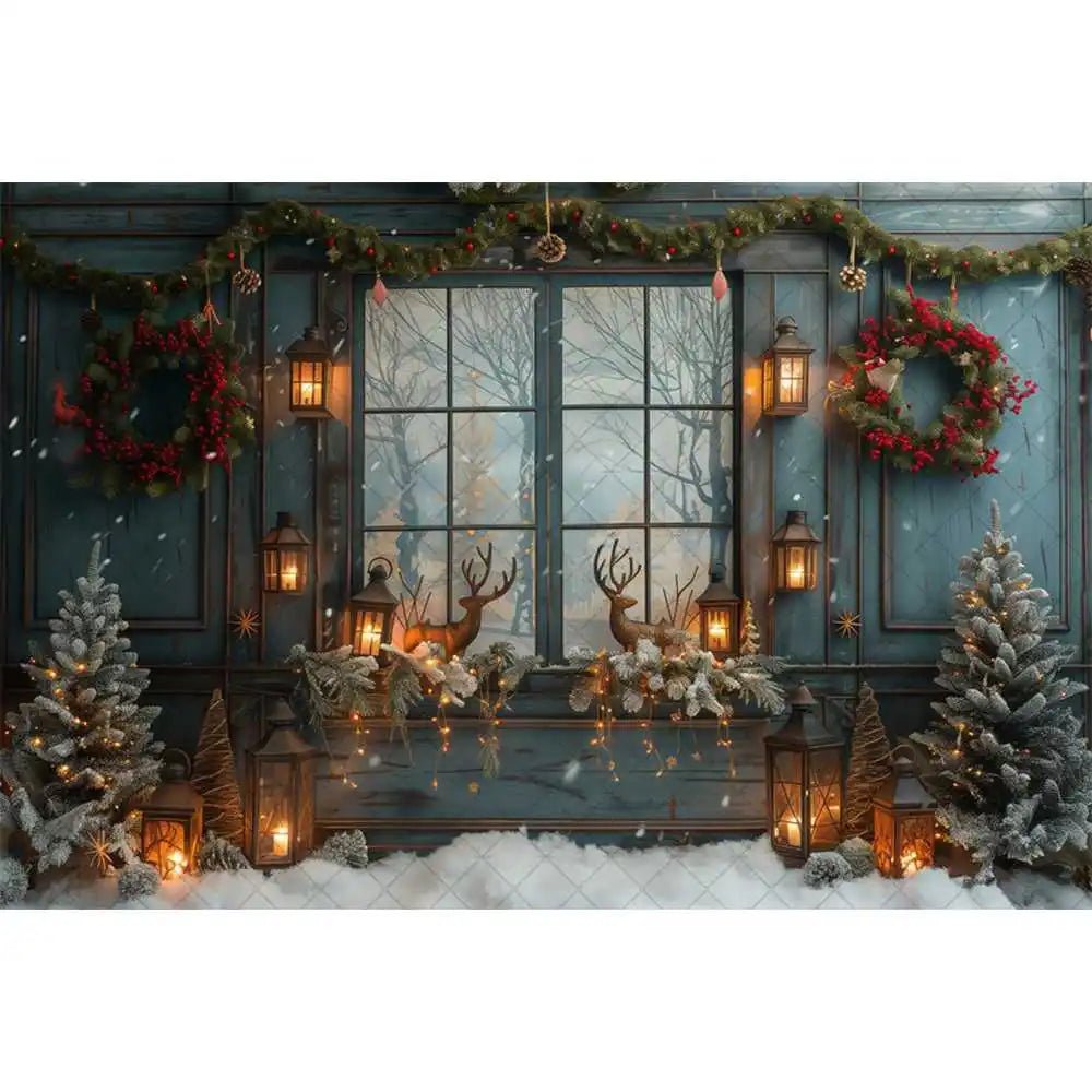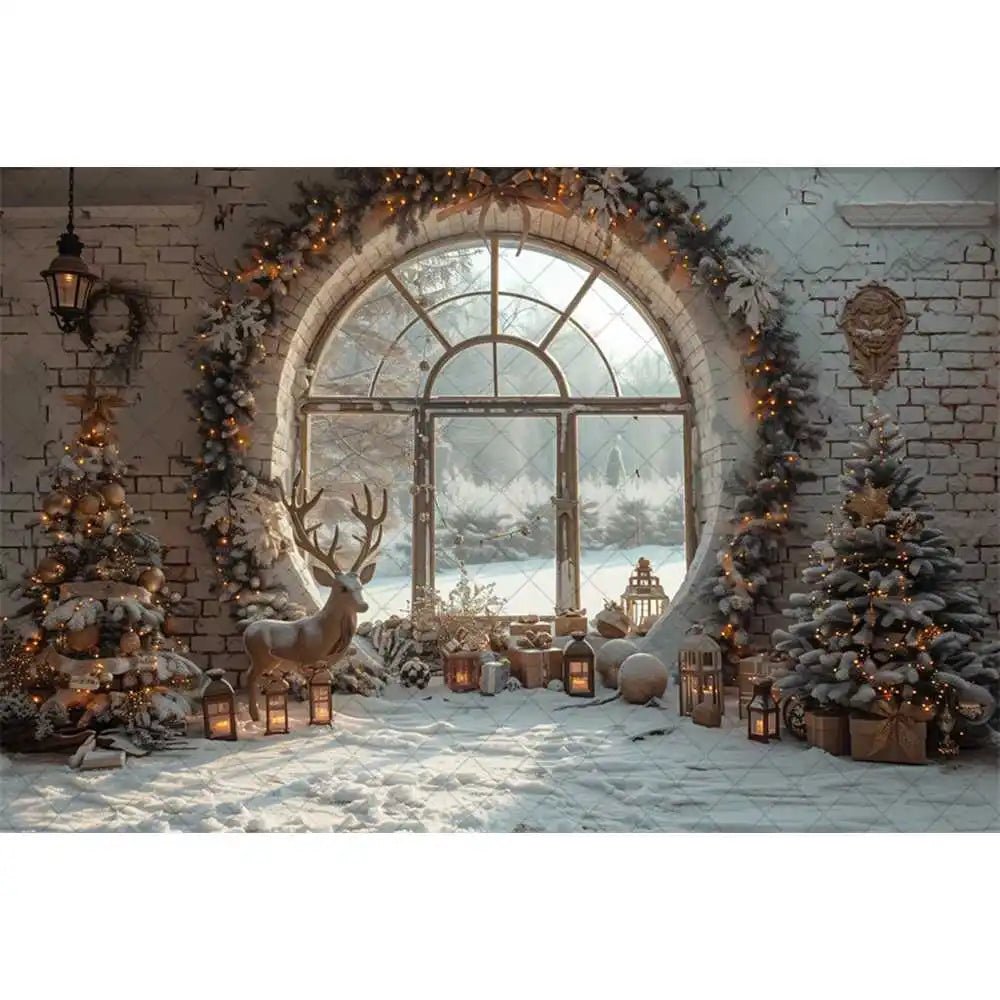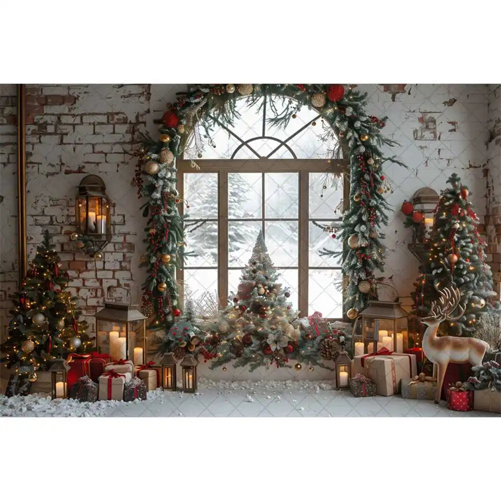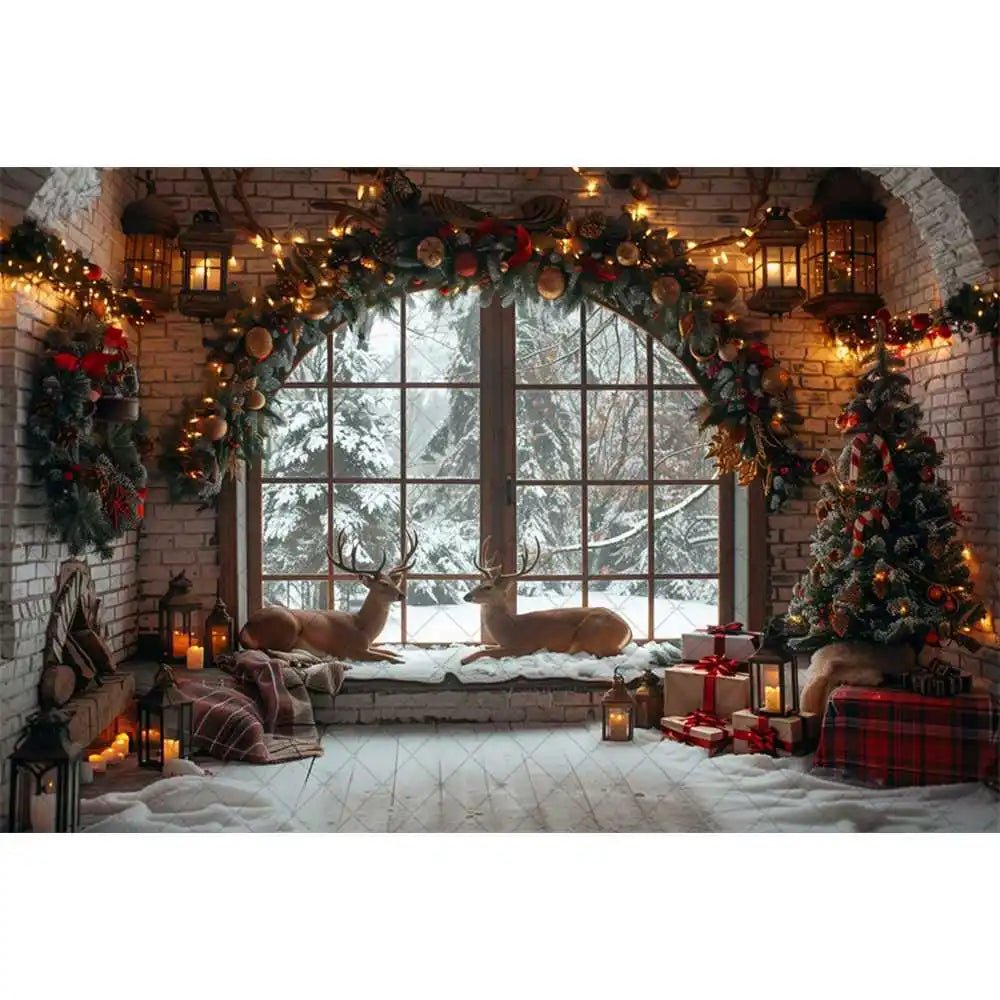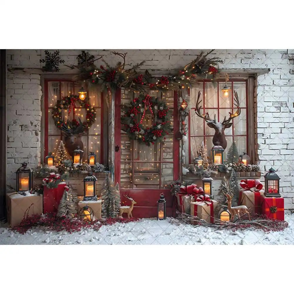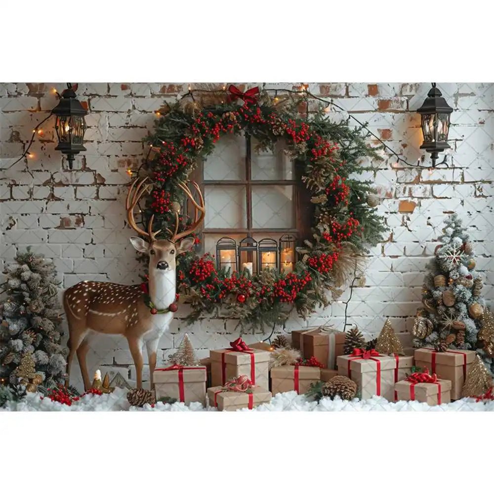 Christmas Photography Backdrop Xmas Tree Wreath Elk Brick Wall Window Snow Scene Backdrop