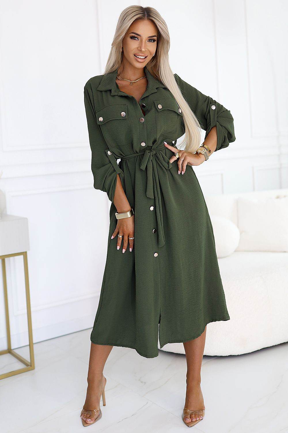 Beige Emery 3/4 Sleeve Midi Dress with Gold Buttons & Waist Tie