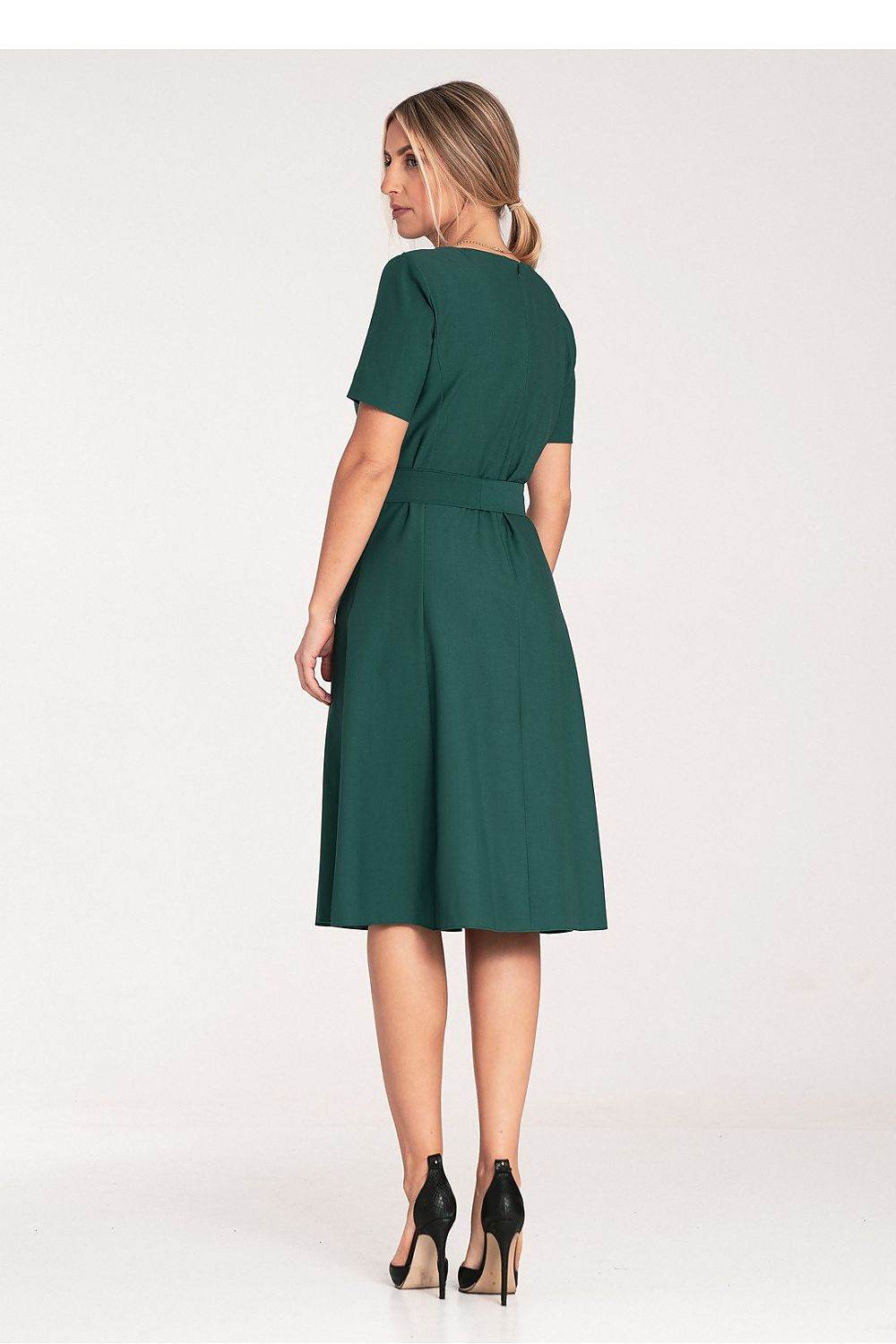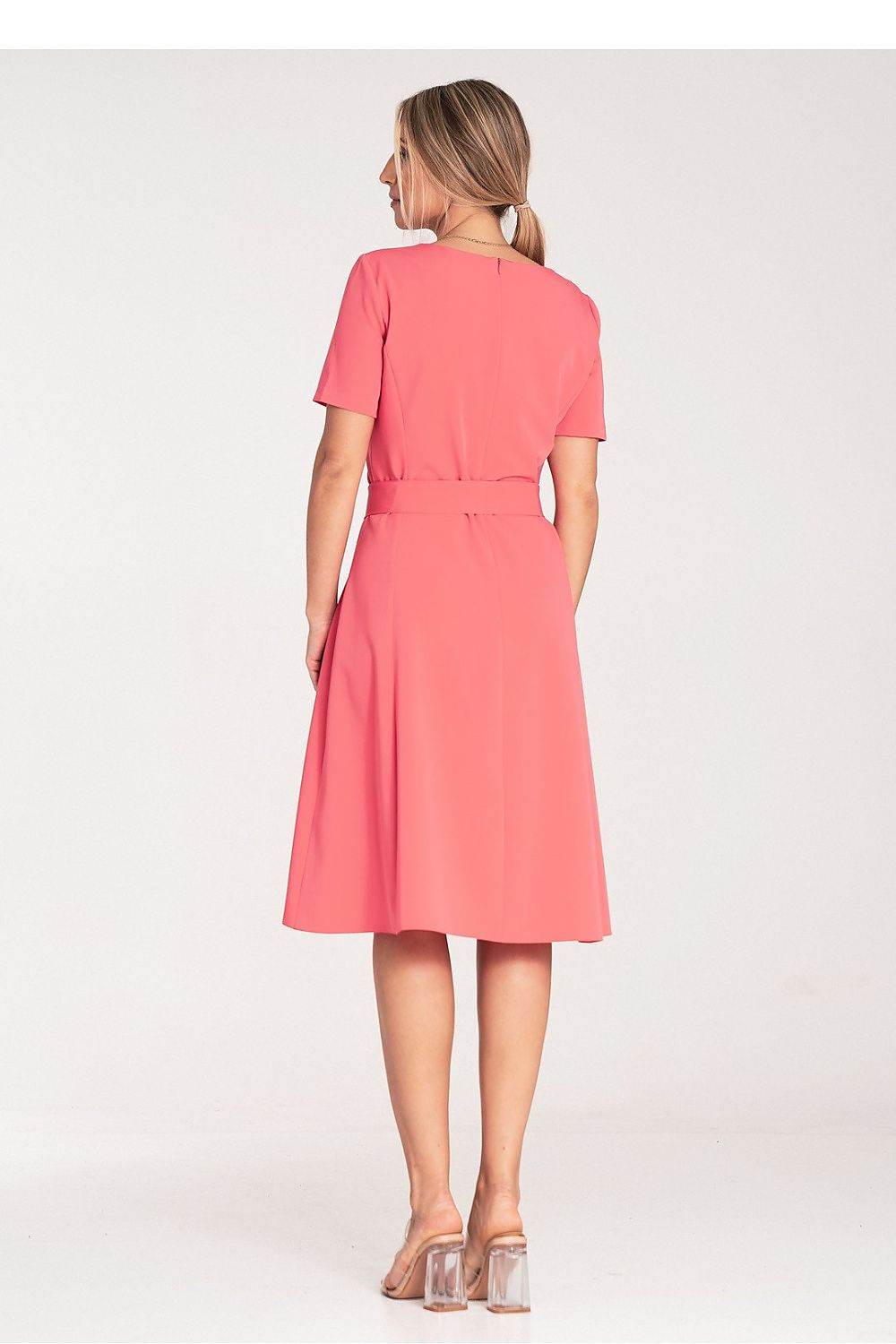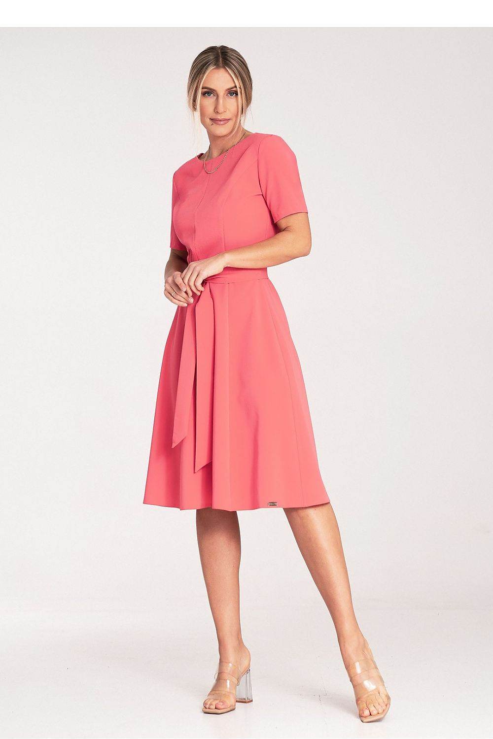 Classic midi dress with pleats and short sleeves. Tied at the waist with a fabric belt, fastened at the back... Read more