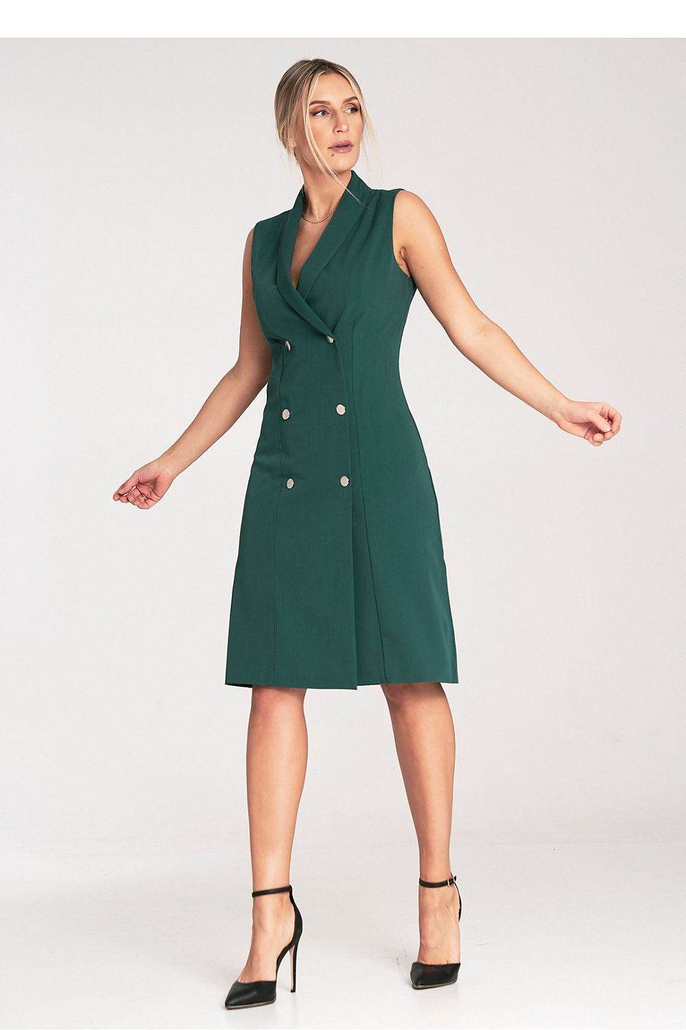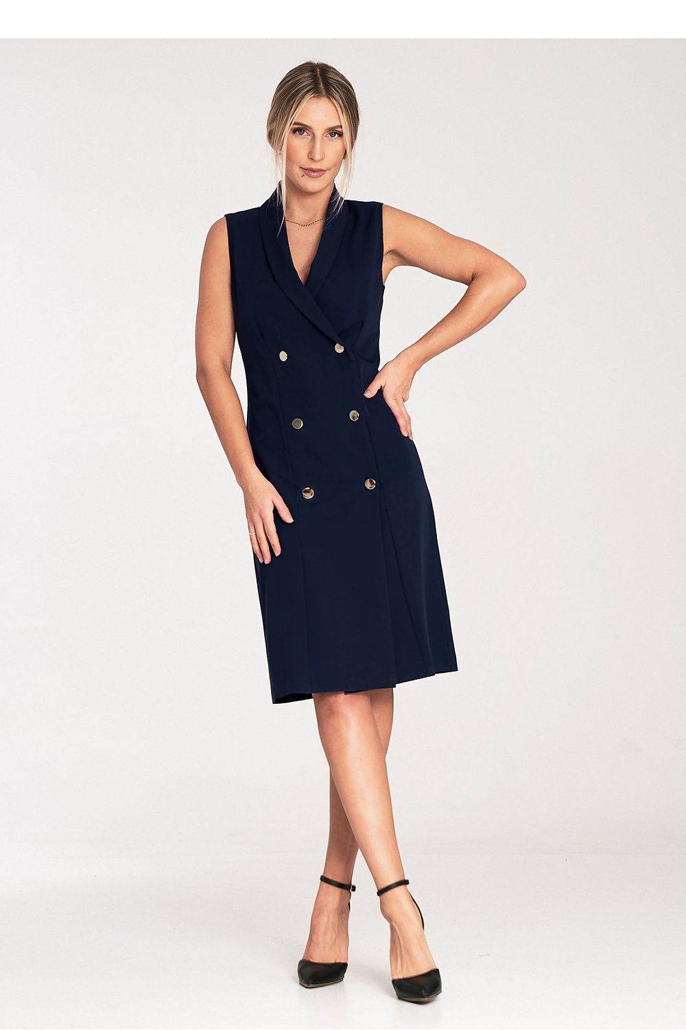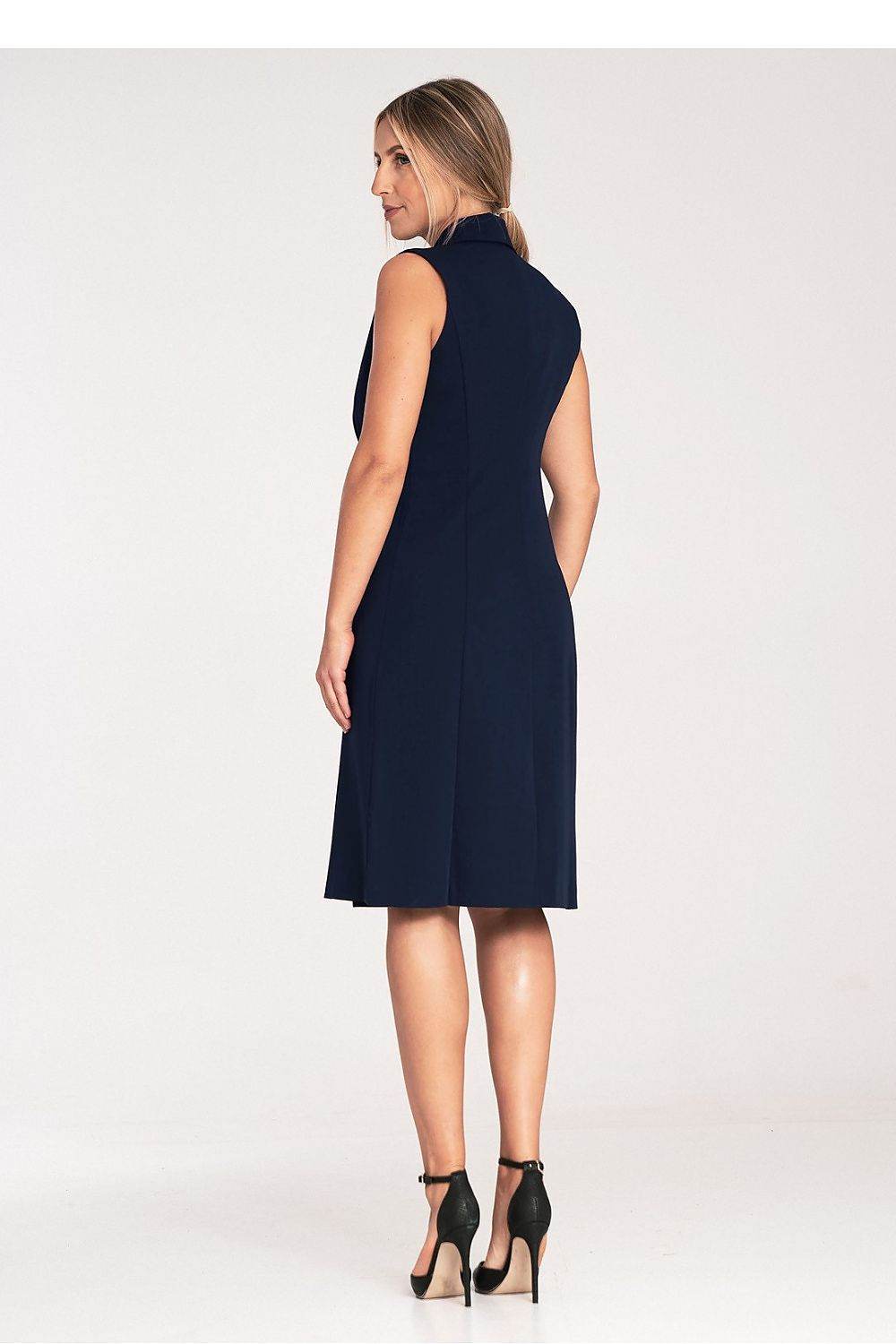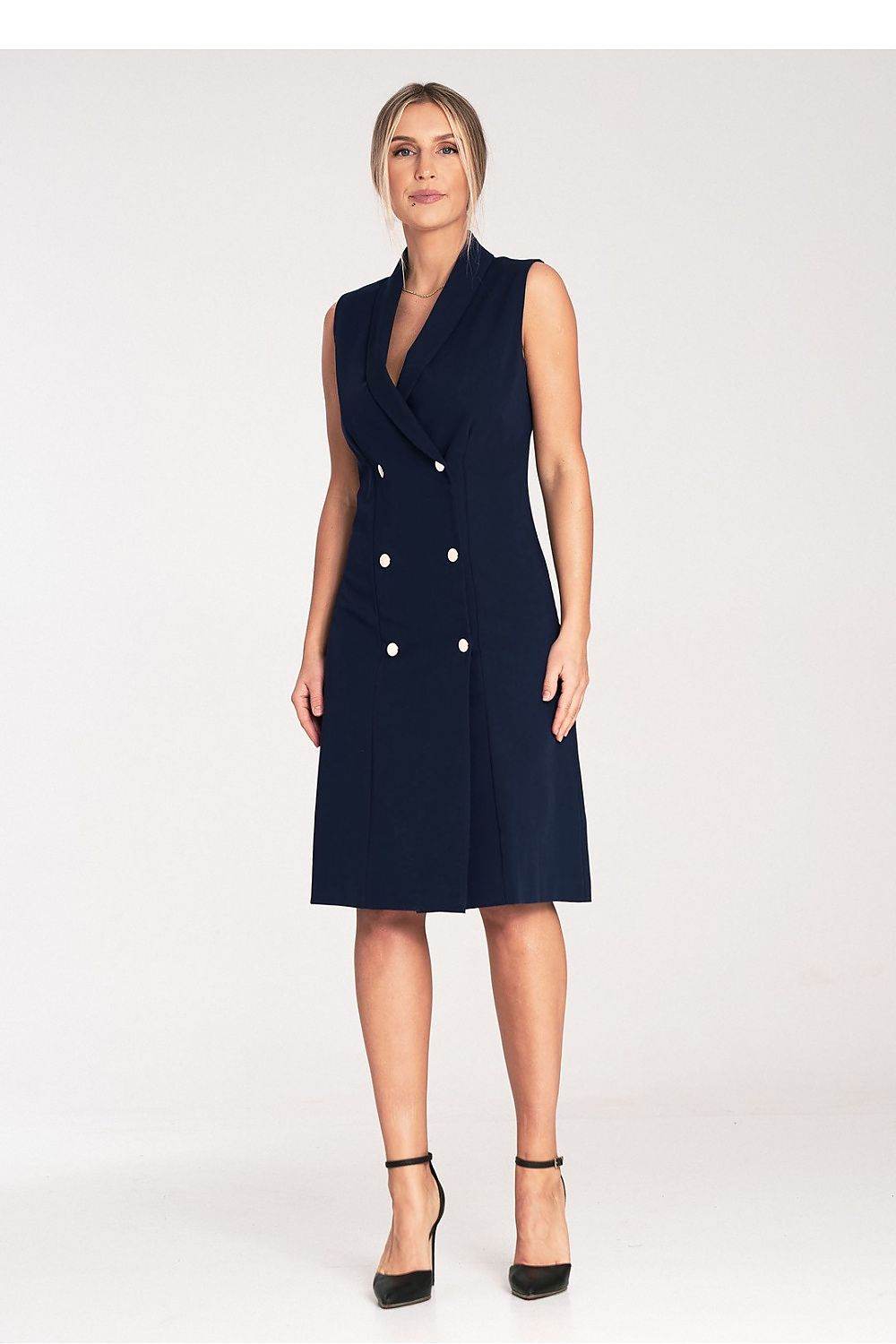 Elegant sleeveless midi dress. Narrow lapels at the front, envelope neckline, double-breasted closure with large decorative snaps. The dress is... Read more