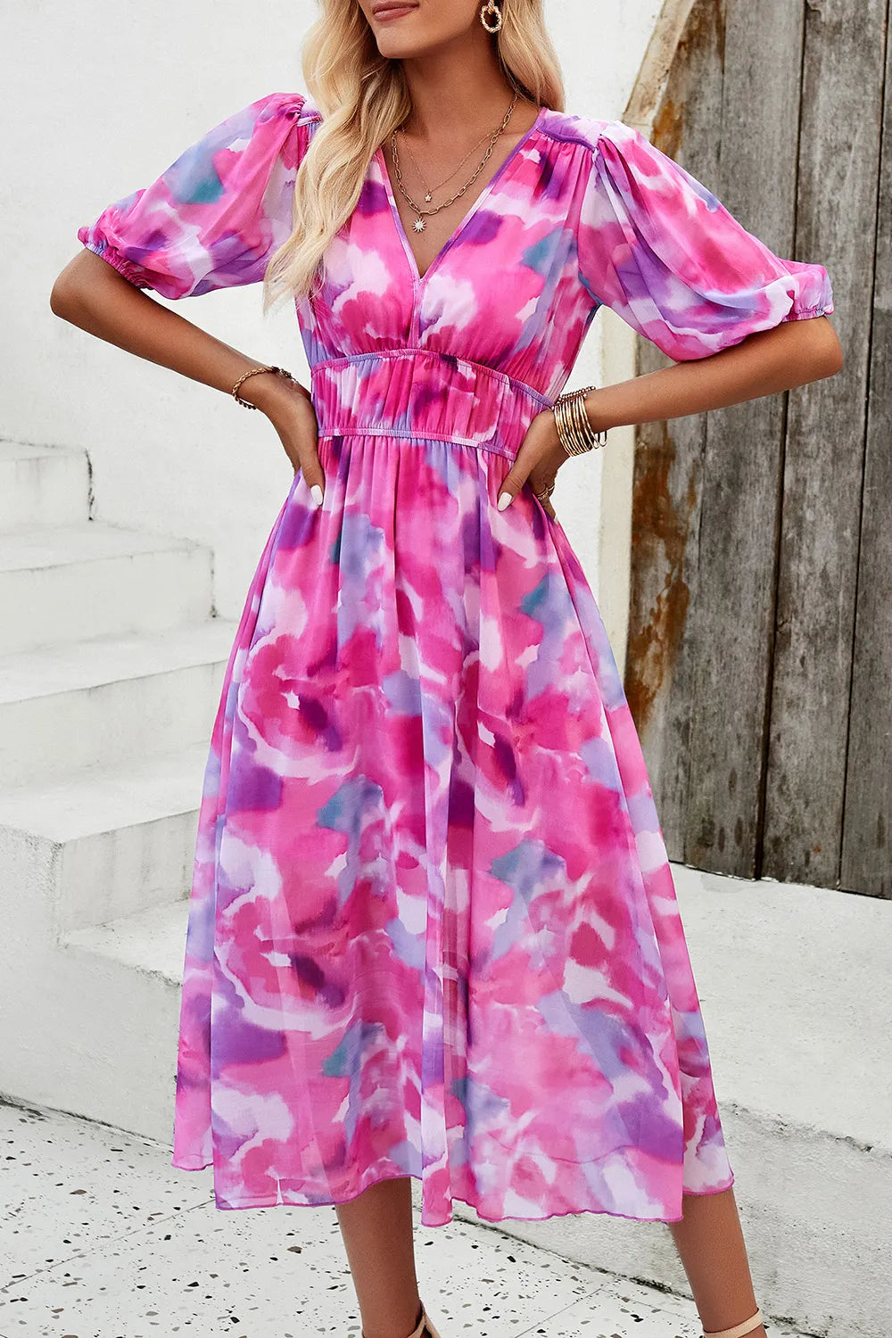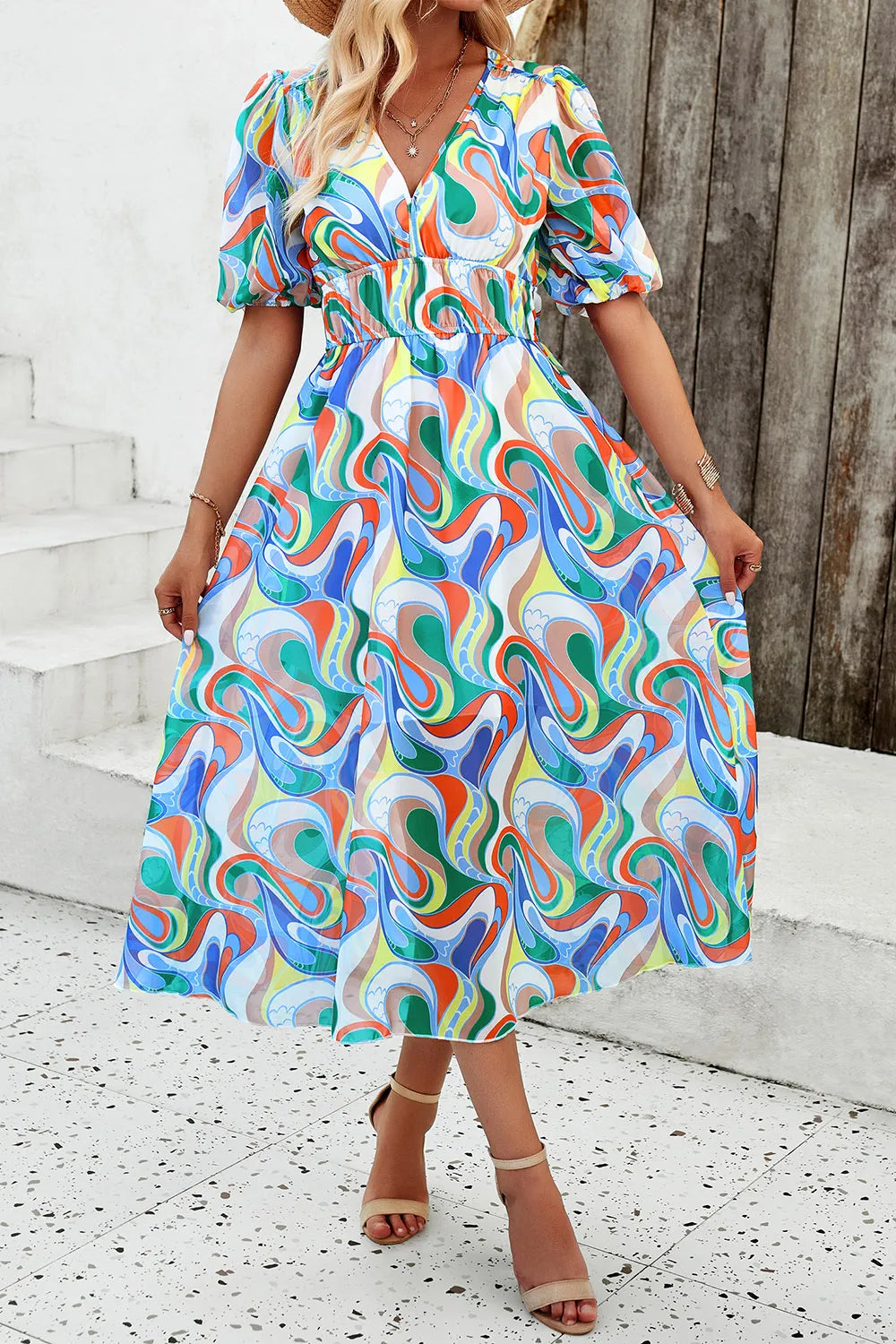Devine Smocked Printed V-Neck Short Sleeve Dress