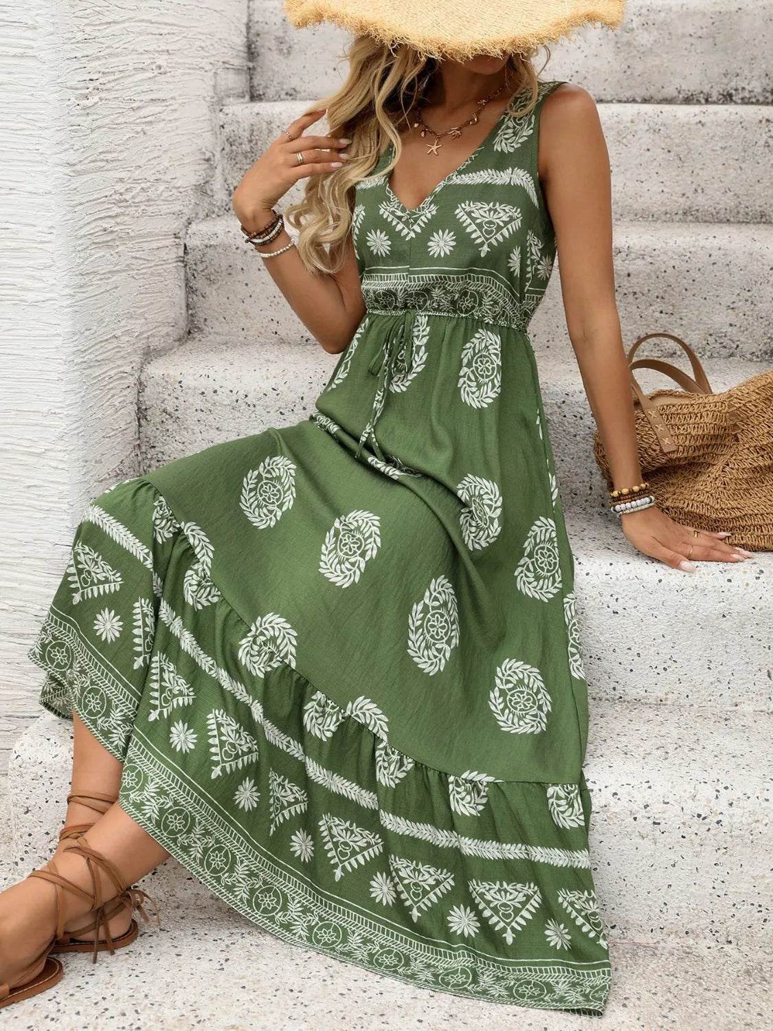 Printed V-Neck Sleeveless Dress