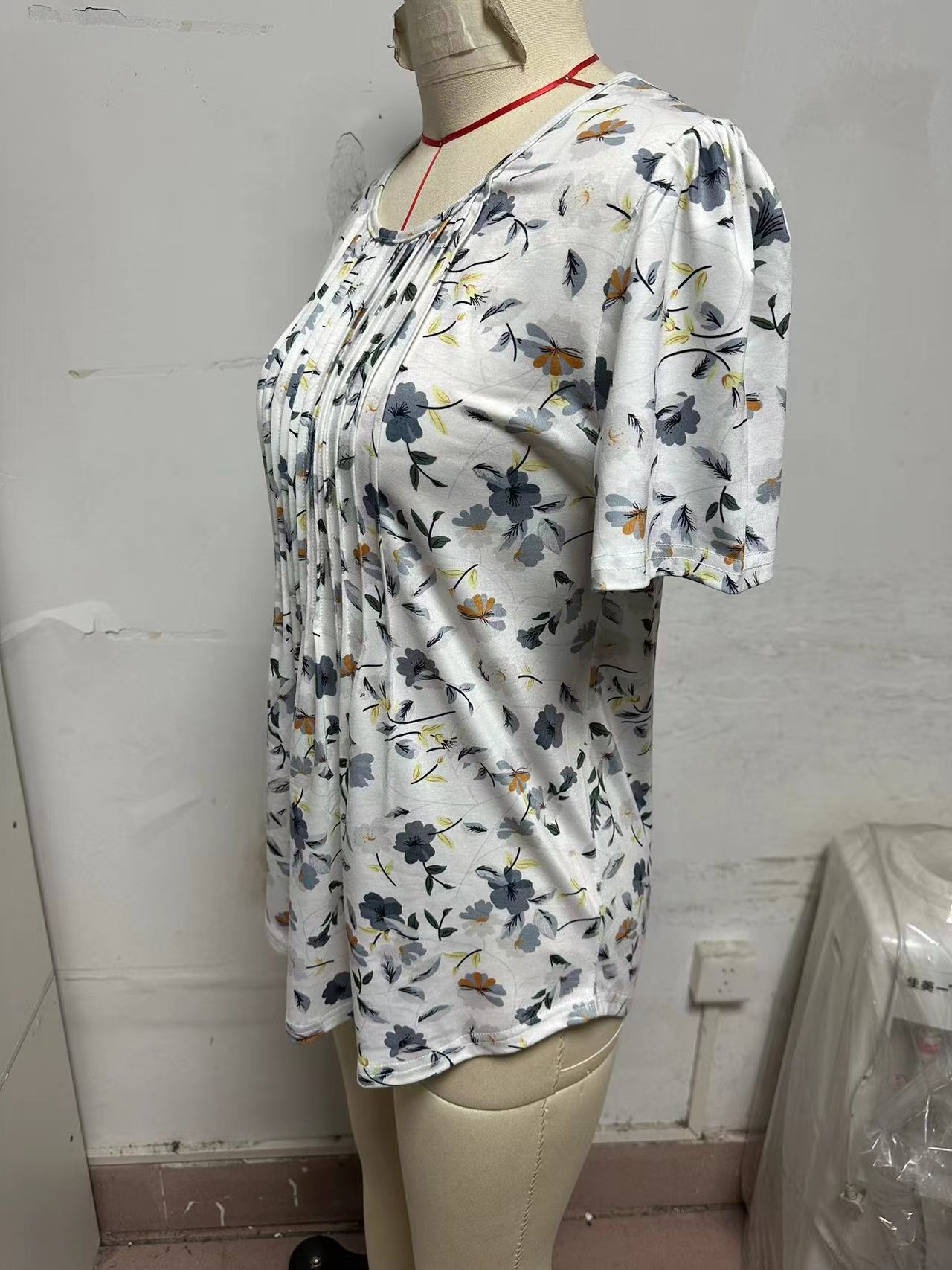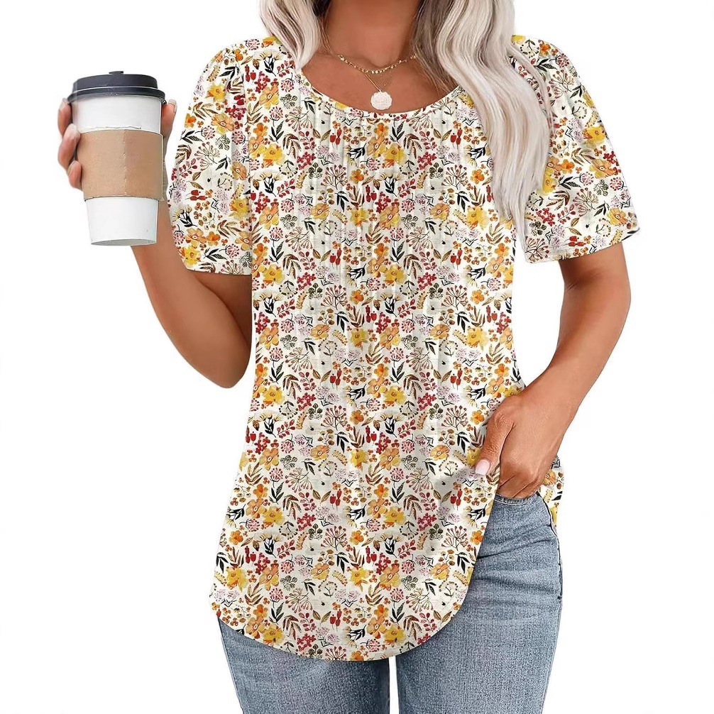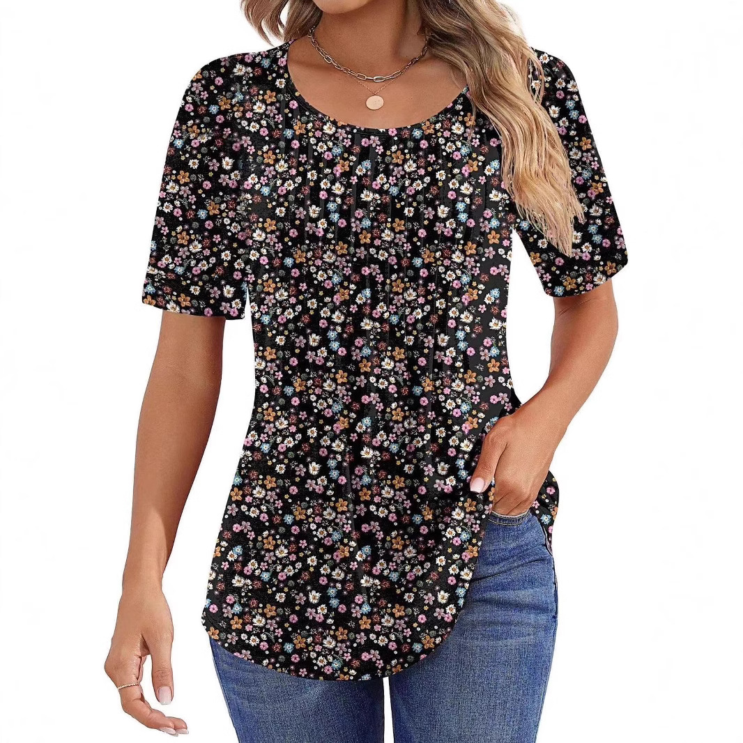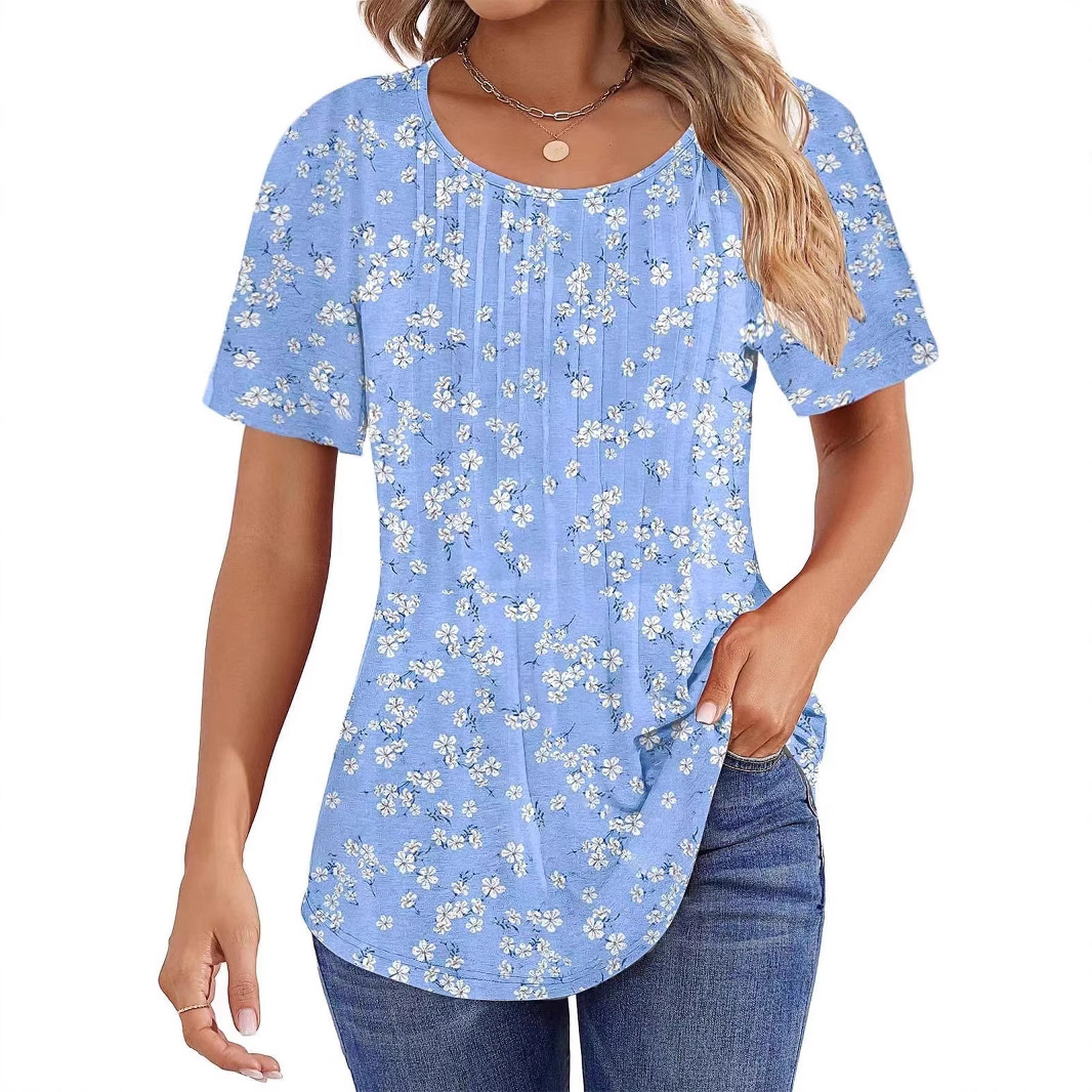 Round Neck Pleated Printed T-shirt