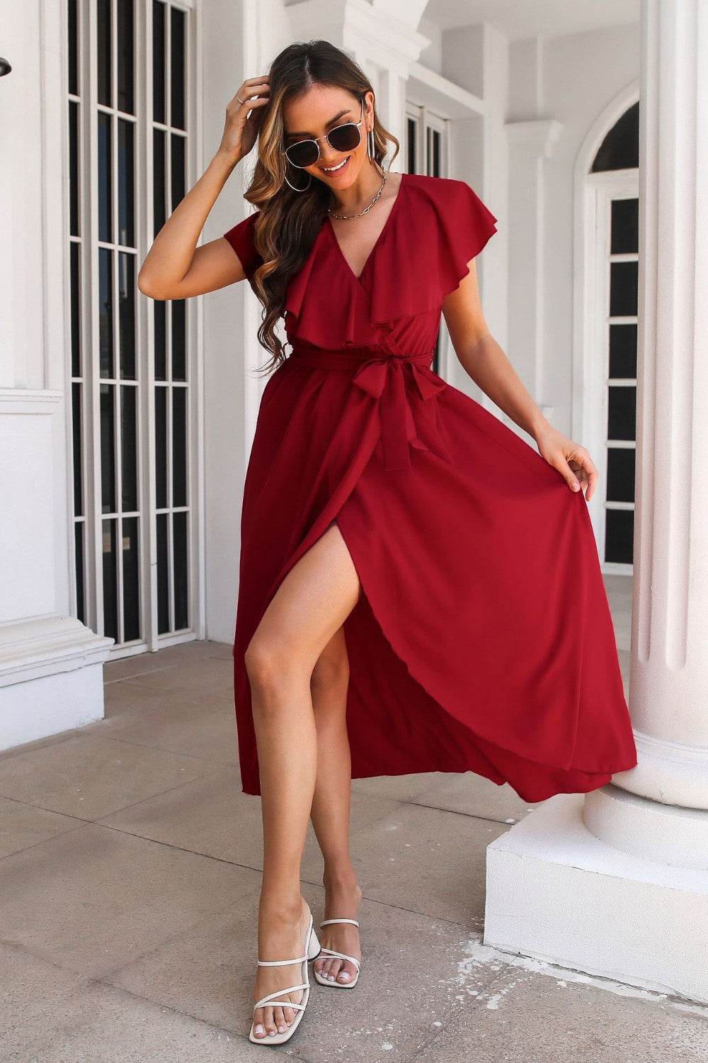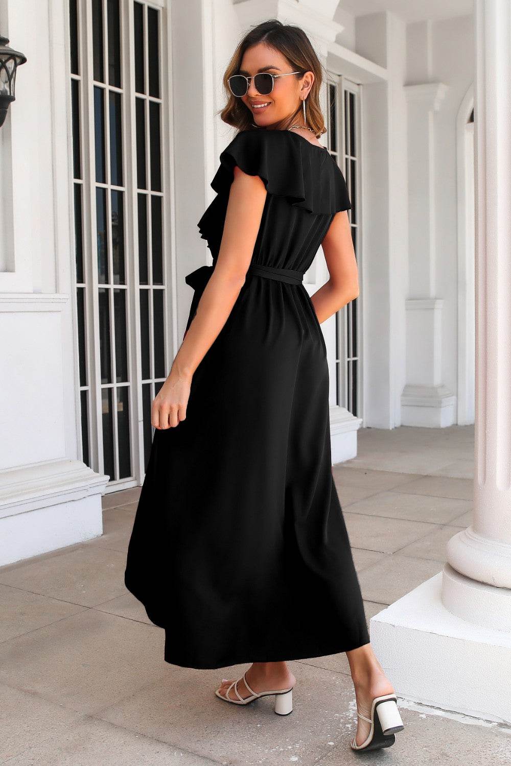 Ruffled Surplice Tie Waist Slit Midi Dress