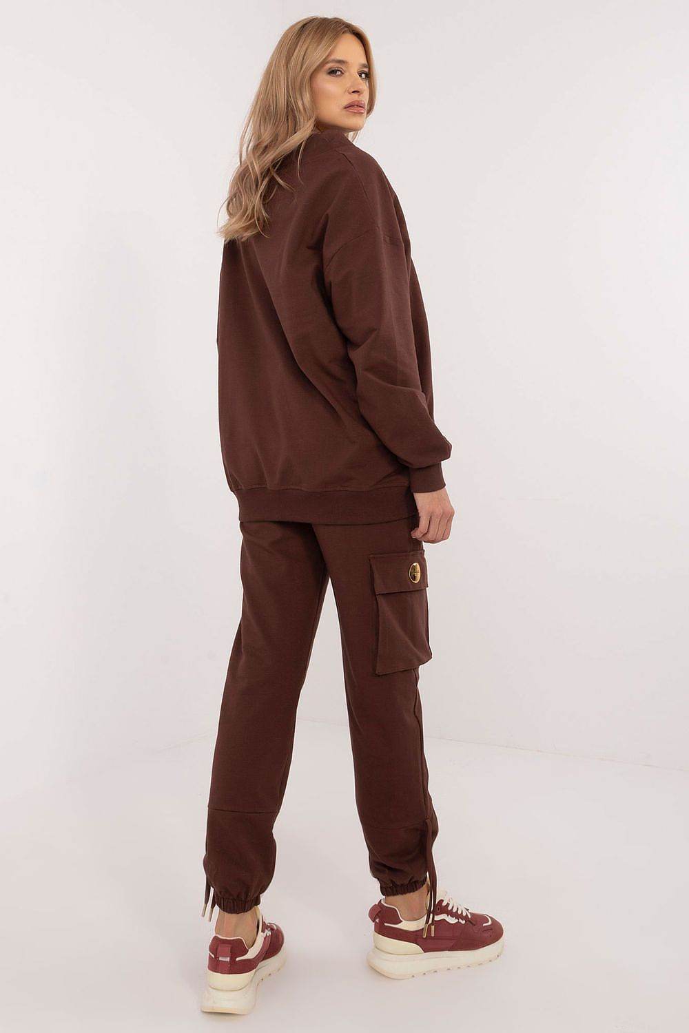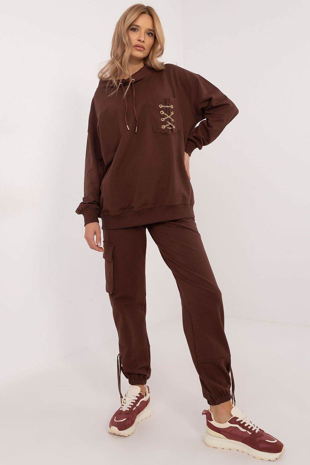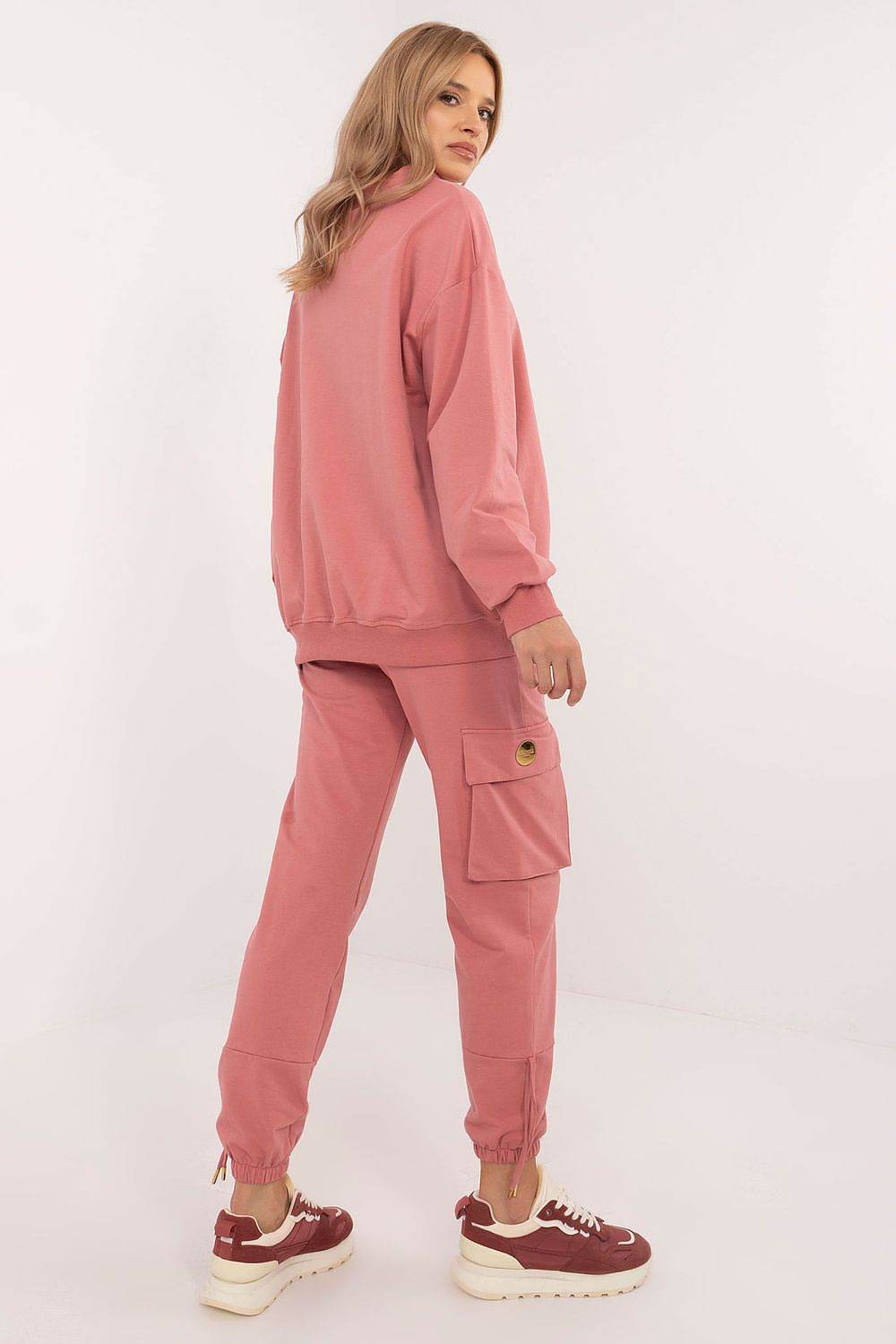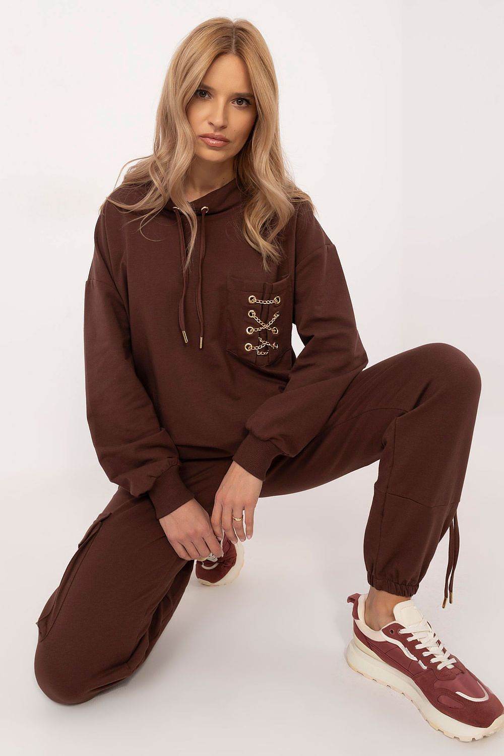 Stylish tracksuit set, consisting of a sweatshirt and pants, perfect for everyday occasions. Made of high quality cotton with a touch of elastane, it provides comfort, flexibility and breathability, ideal for active days. The sweatshirt with a round neckline has a practical pocket on the front decorated with a trendy chain, adding an original accent to the set. The high-waisted pants with slip pockets on the sides are comfortable and functional, and the cuffs at the bottom of the legs ensure a perfect fit. The smooth pattern makes the set versatile and easy to combine with other wardrobe pieces. This is the perfect choice for women who appreciate a combination of comfort and stylish look in their everyday wear.