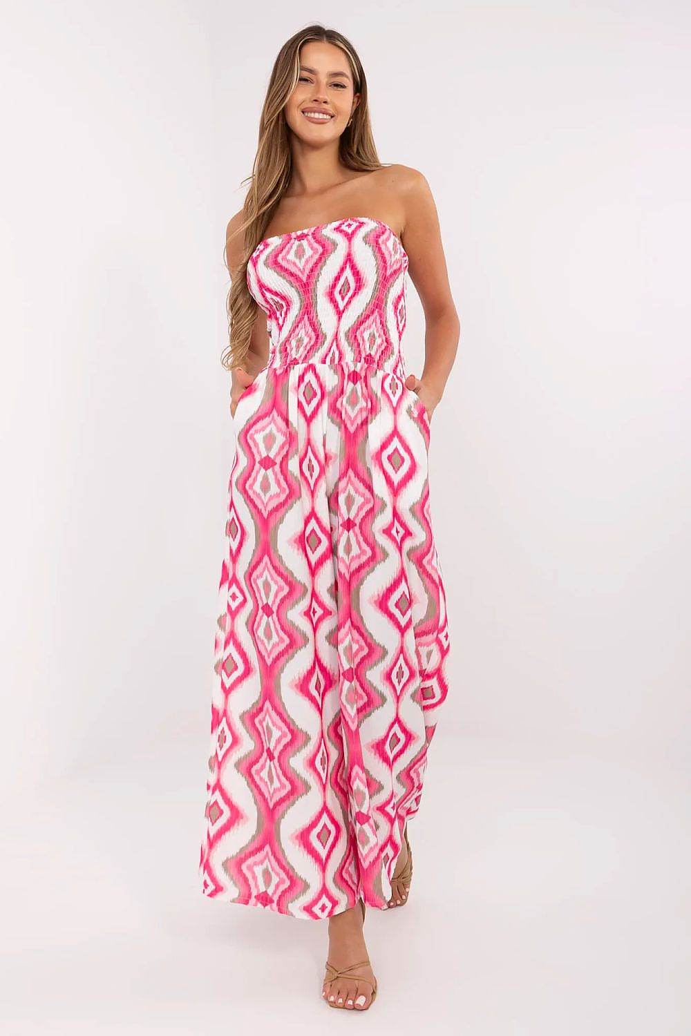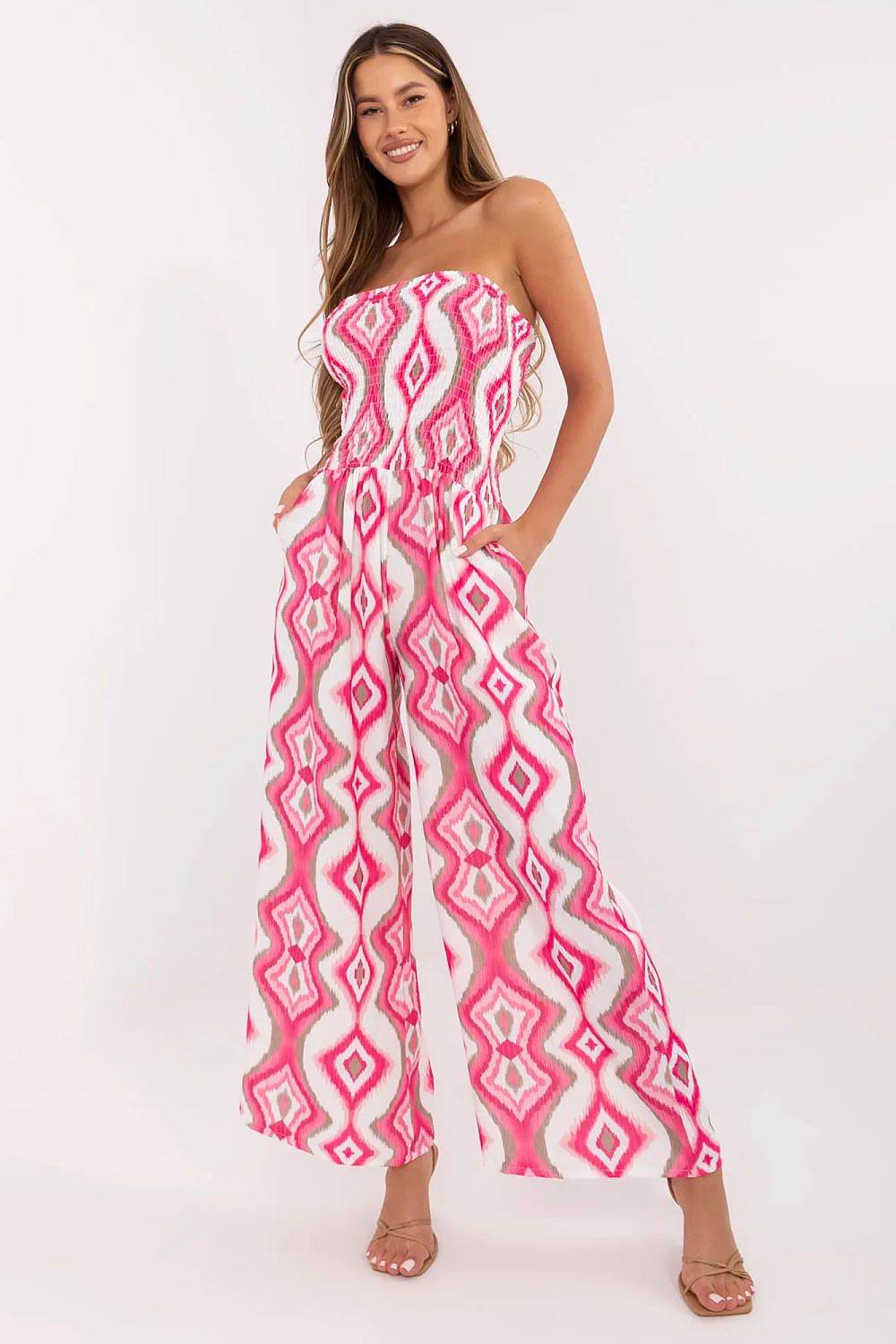 Stylish and comfortable jumpsuit with a geometric pattern is the perfect choice for everyday wear. Made of lightweight, breathable viscose, it is perfect for warmer days, providing comfort and freedom of movement. The modern design combines feminine style with urban casualness. Sleeveless model, with a rectangular neckline and delicate ruching in the upper part, which adds volume and subtle charm. Sewn-in padded cups provide good breast support and allow you to wear the jumpsuit without a bra. The lack of fastening makes it easy to put on, just slip it over your head. The long, wide legs beautifully drape and visually elongate the silhouette, while practical, slip-in pockets add functionality. It is a perfect choice for everyday outings, walks, or meetings when you want to look fashionable and feel comfortable at the same time.