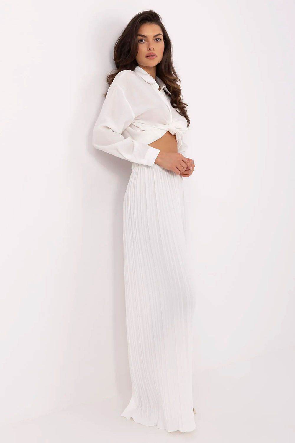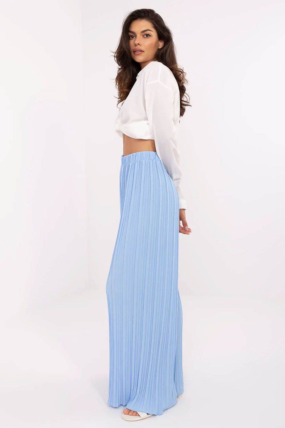 Comfortable and stylish women's trousers made of structured fabric are a must-have in everyday wardrobe. The casual character combined with minimalist design makes them perfect for a walk, shopping, or work in a more relaxed style. The high-waisted model, without a fastening, features an elastic waistband for a perfect fit and comfort throughout the day. The smooth, slightly textured polyester fabric drapes beautifully, and the wide legs visually lengthen the legs and give the silhouette a lightness. The trousers do not have pockets, highlighting their simple, modern form. This is a versatile wardrobe staple that can easily be paired with both a t-shirt and an elegant shirt.
