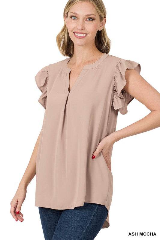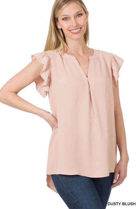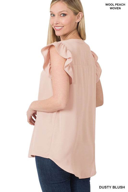 Woven Wool Peach Ruffled Sleeve High-Low Top