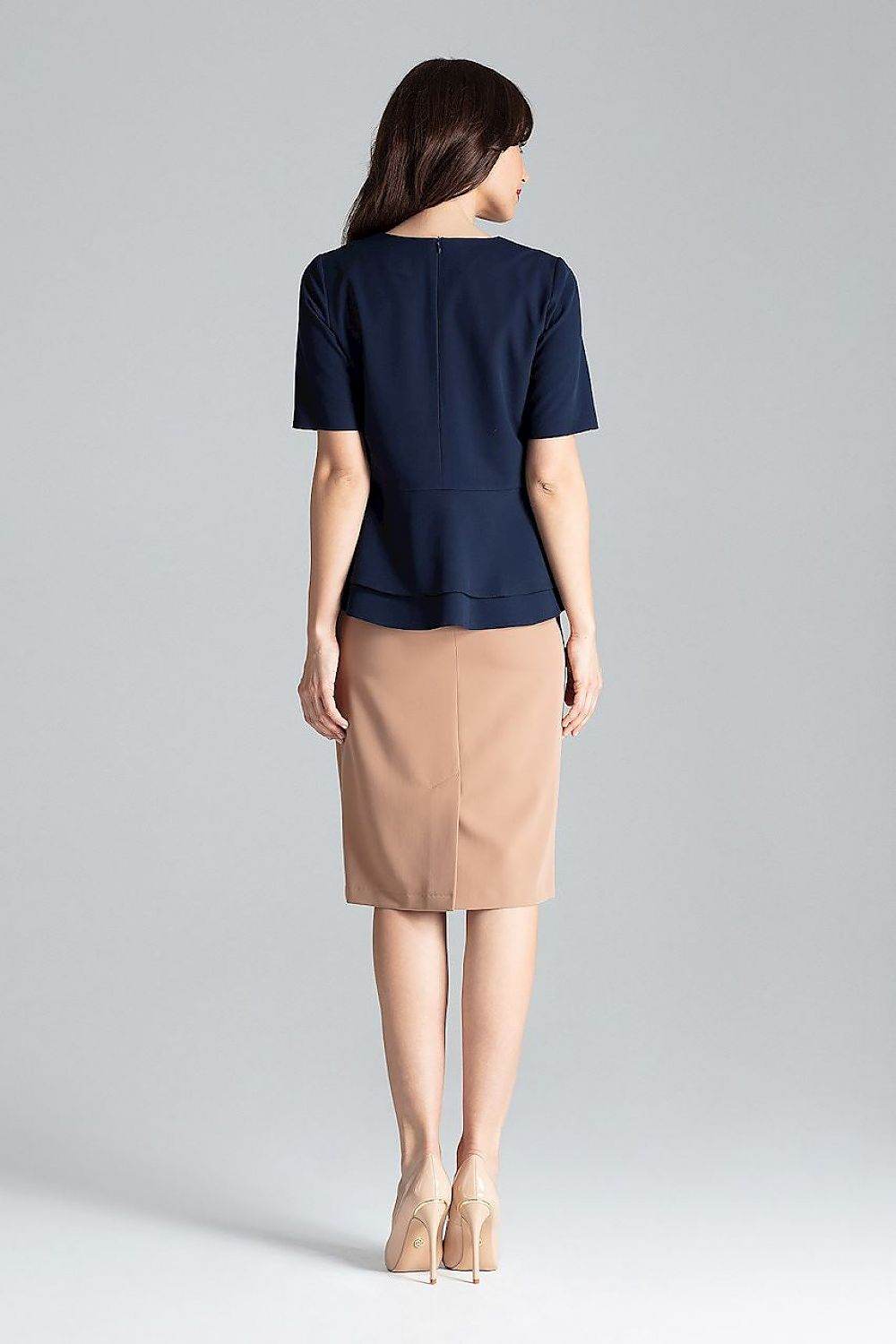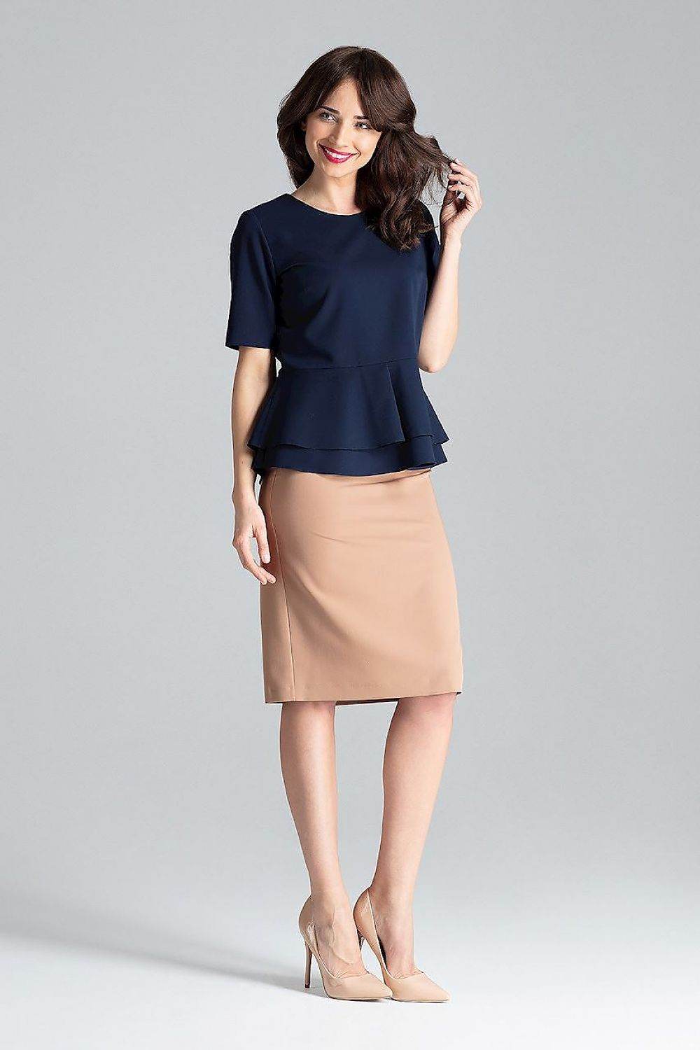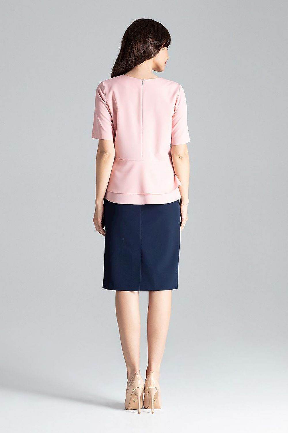 Blusa de manga curta com decote semicircular e zíper traseiro oculto. O modelo com babado duplo combina bem com saia... Read more