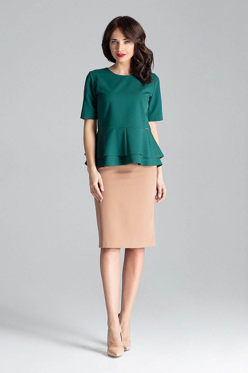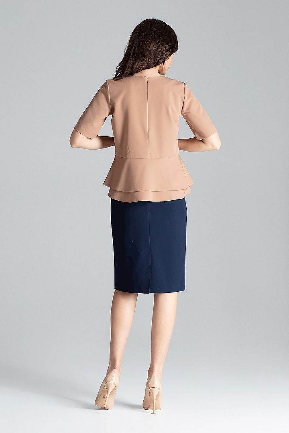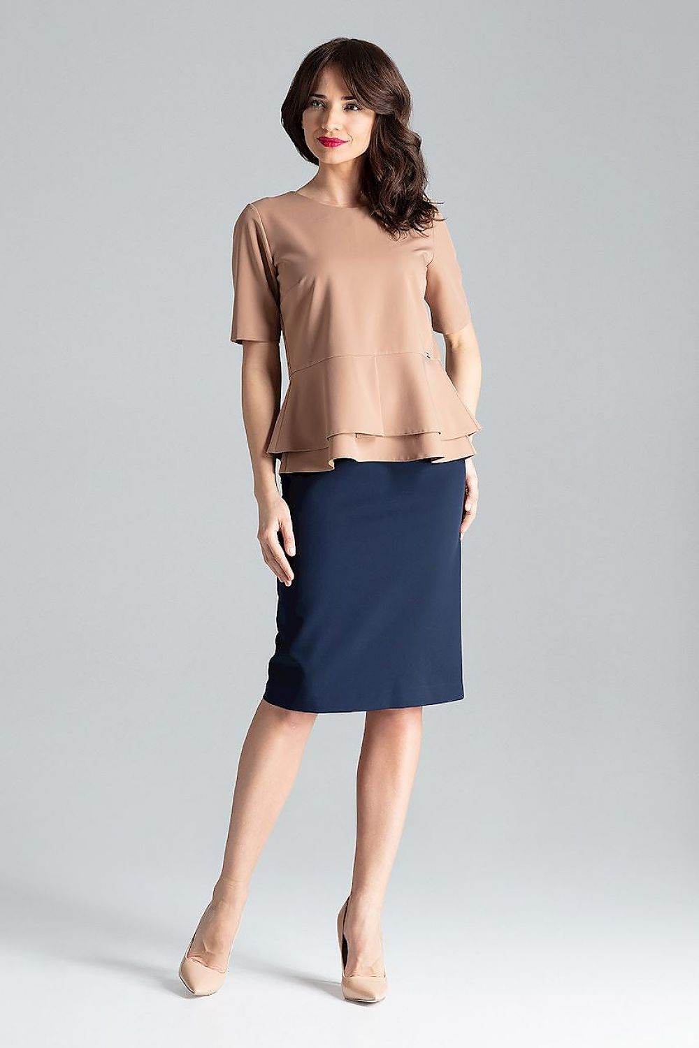 Blusa de manga curta com decote semicircular e zíper traseiro oculto. O modelo com babado duplo combina bem com saia... Read more