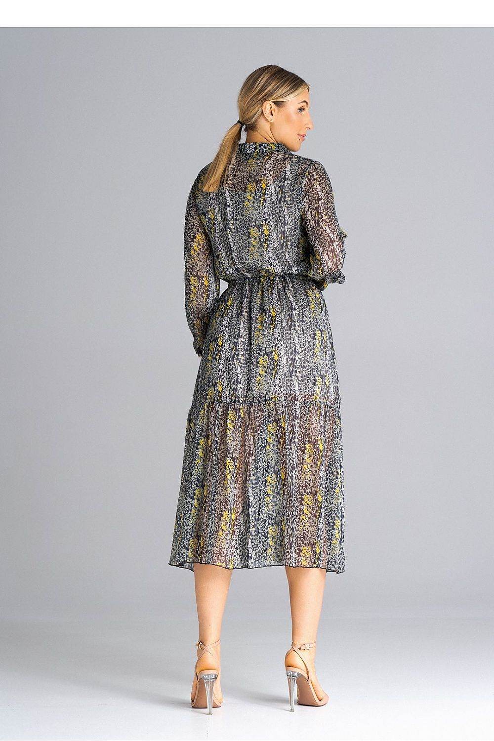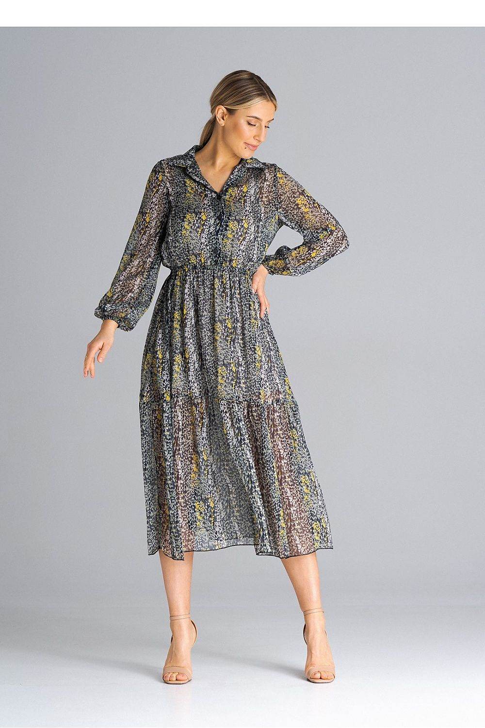 Vestido midi, evasê e forrado. Vestido com mangas compridas franzidas com elástico, decote com gola. O vestido é abotoado até... Read more