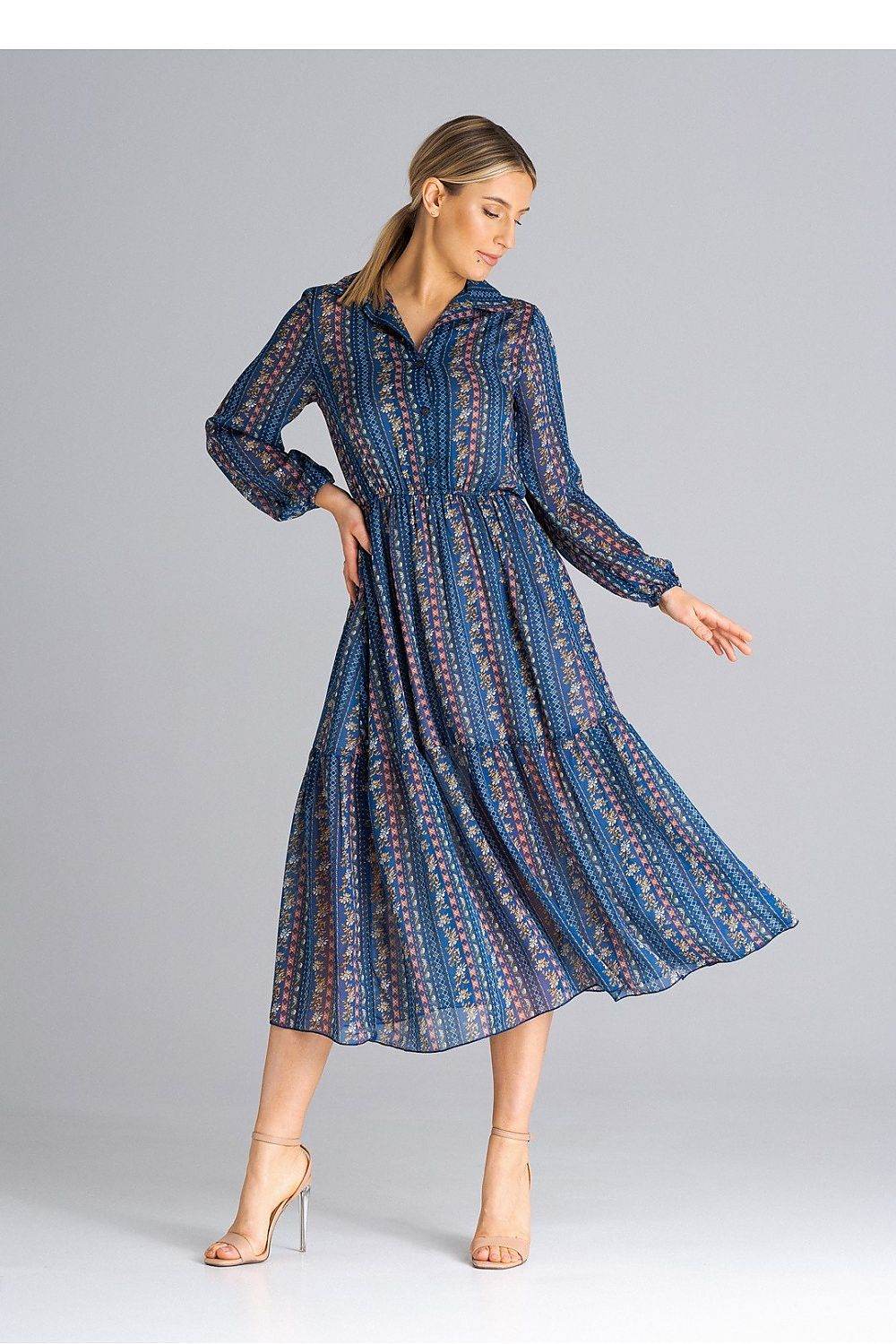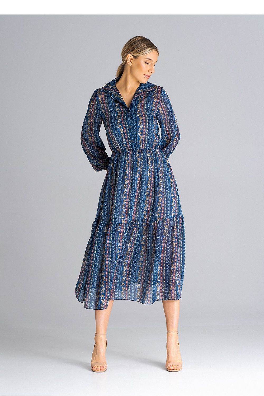 Vestido midi de manga comprida evasê com botões frontais, gola e bainha com babados