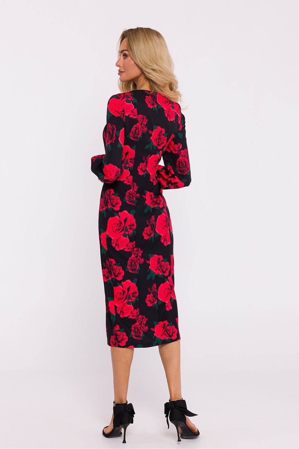 Vestido midi estampado com decote carmesim, mangas bufantes e fenda frontal