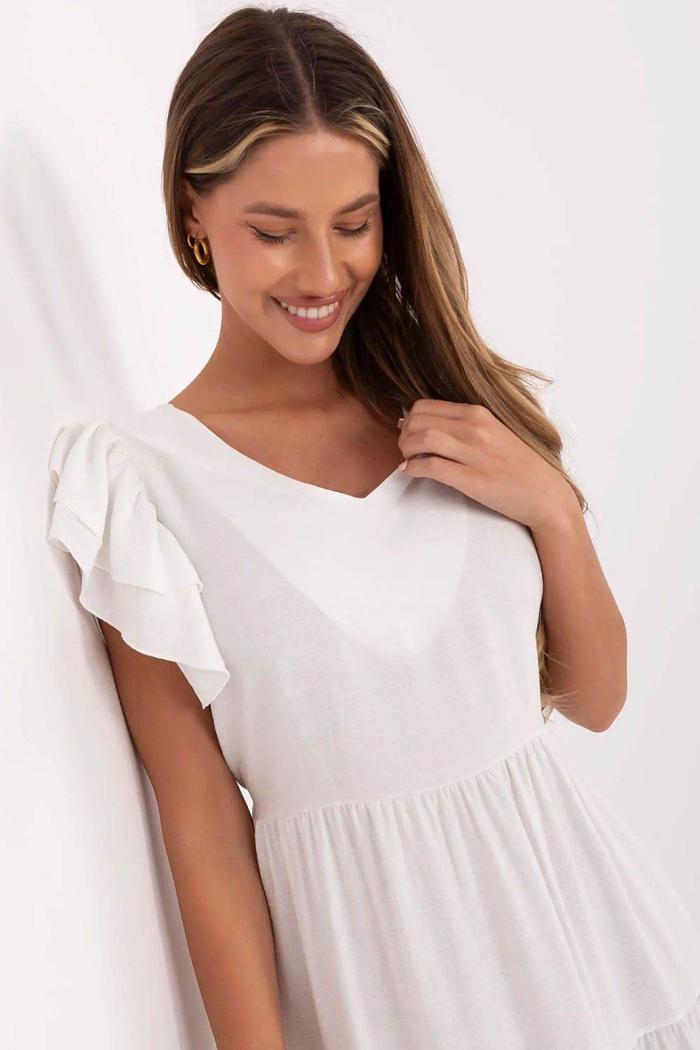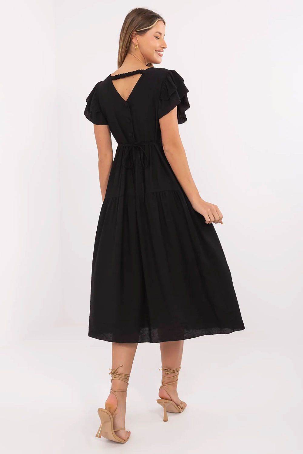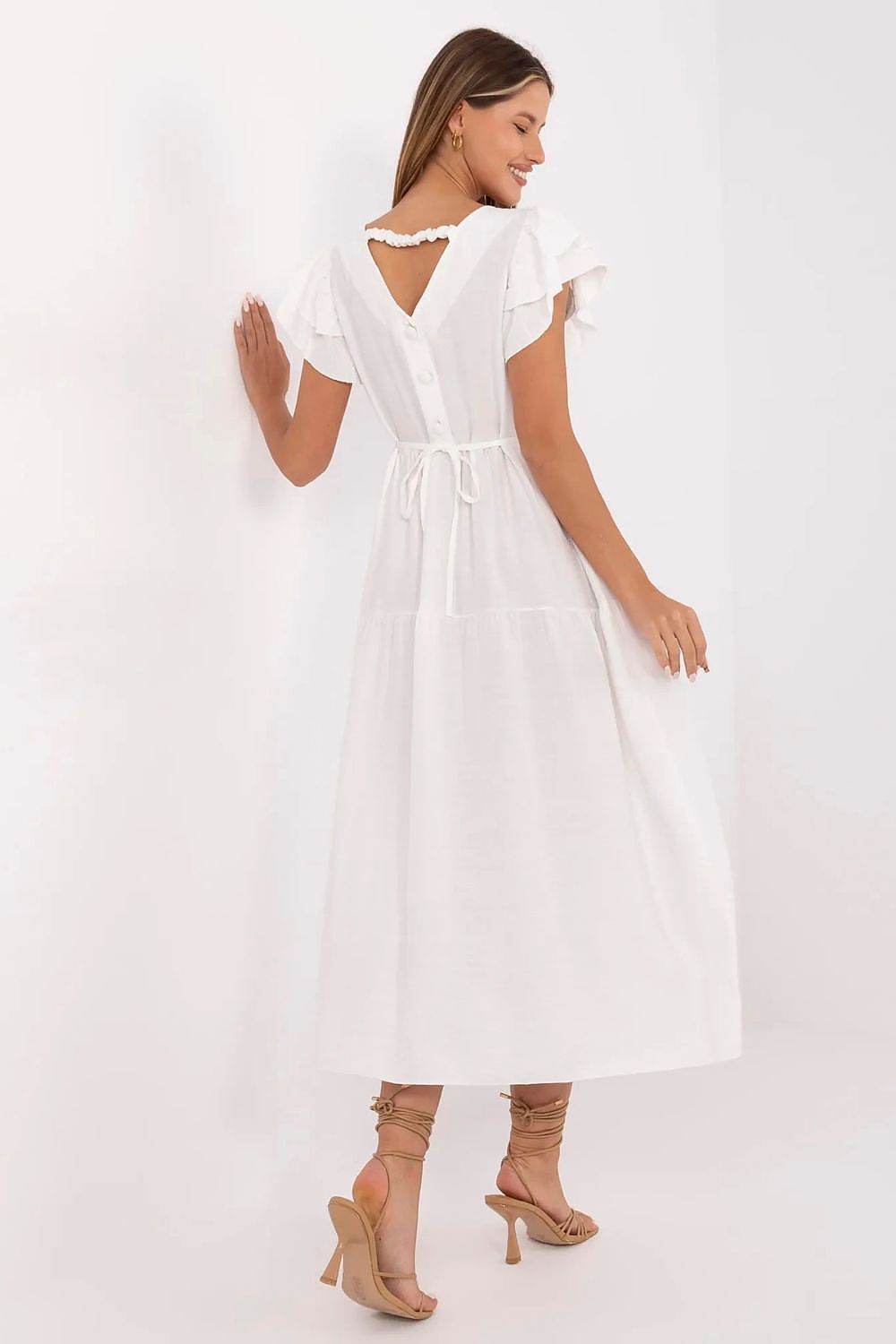 Stylish and feminine summer dress with a flared cut is a perfect choice for everyday wear and work. Made of a light and breathable blend of viscose and nylon, it ensures comfort even on the warmest days. The midi length model beautifully shapes the silhouette, and the tie at the waist allows for subtle waist accentuation. The smooth material gives the dress a universal, elegant character, making it easy to match with different stylizations. The short flutter sleeves add lightness and romantic charm, while the V-neck visually slims the neck and adds a feminine charm. The dress is buttoned at the back, which is a stylish detail and makes it easy to put on. This is an ideal proposition for women who value comfort, elegance, and functionality, both in their daily rush and during quieter summer days.
