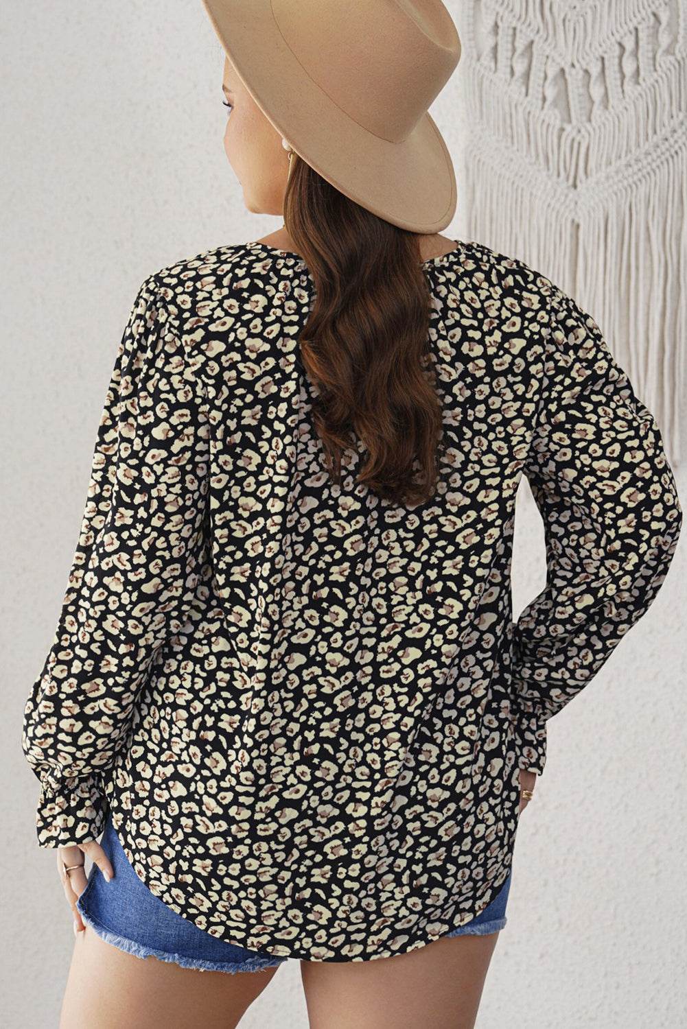 Blusa Plus Size Floral Flounce Sleeve Tie-neck