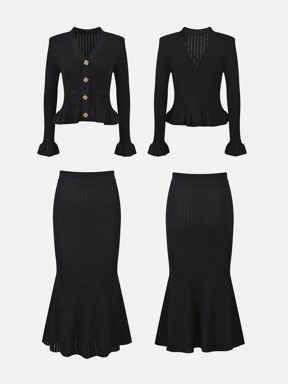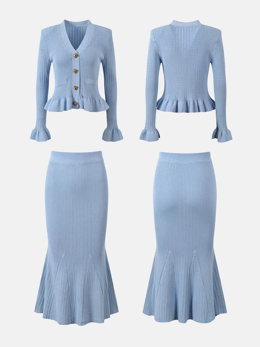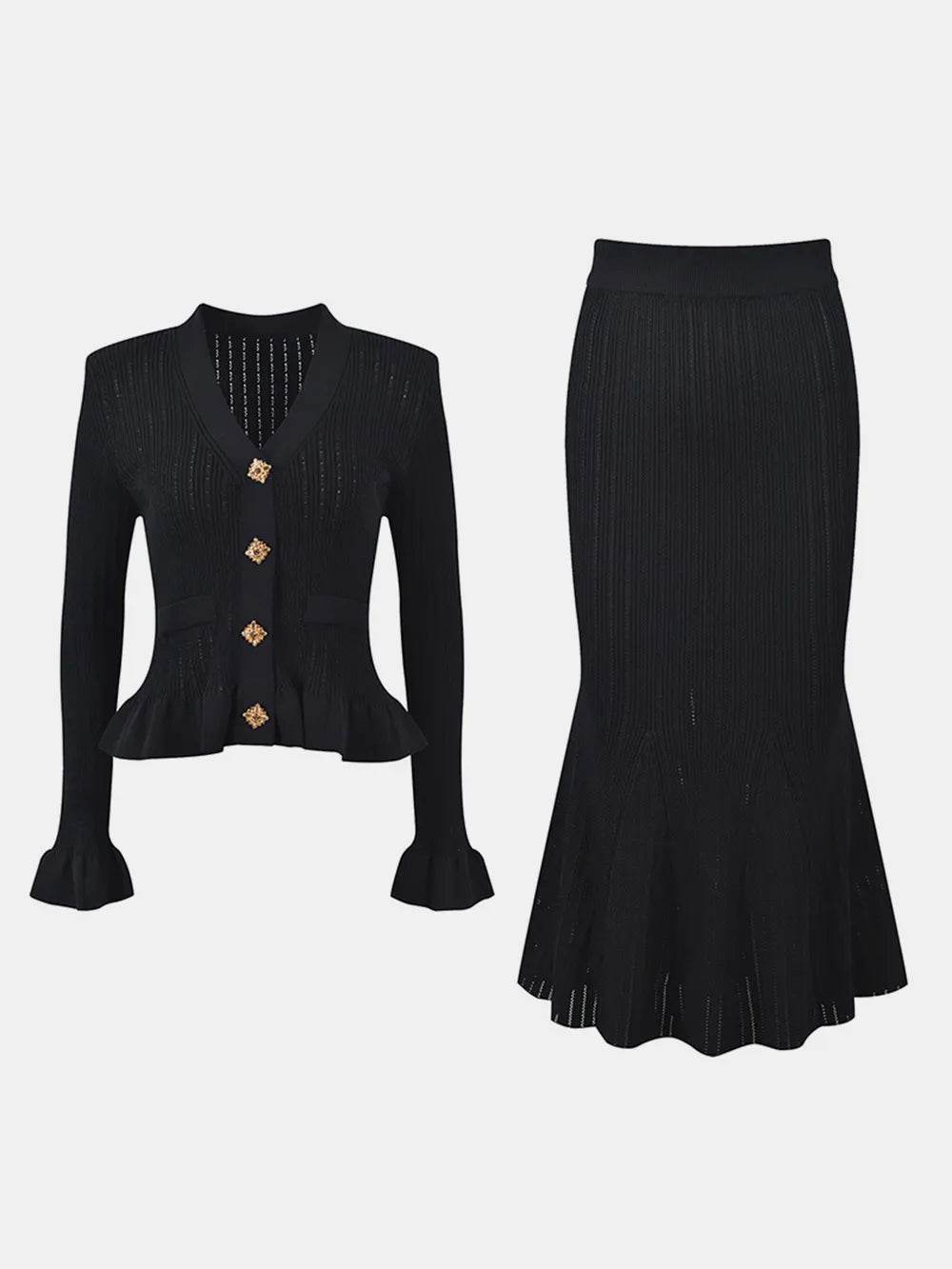 Conjunto de blusa com decote em V e saia midi com babados