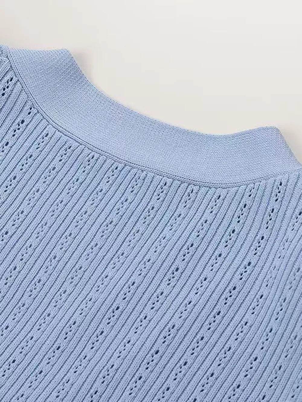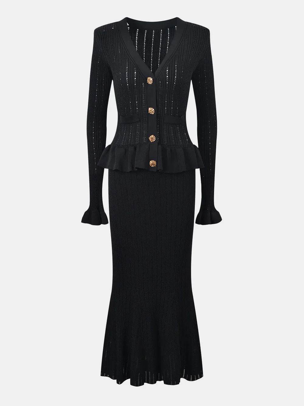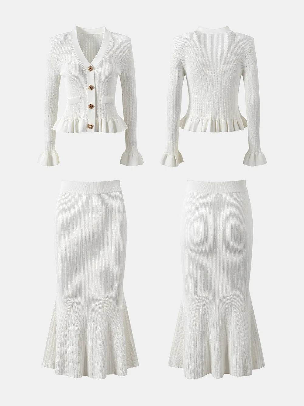 Conjunto de blusa com decote em V e saia midi com babados
